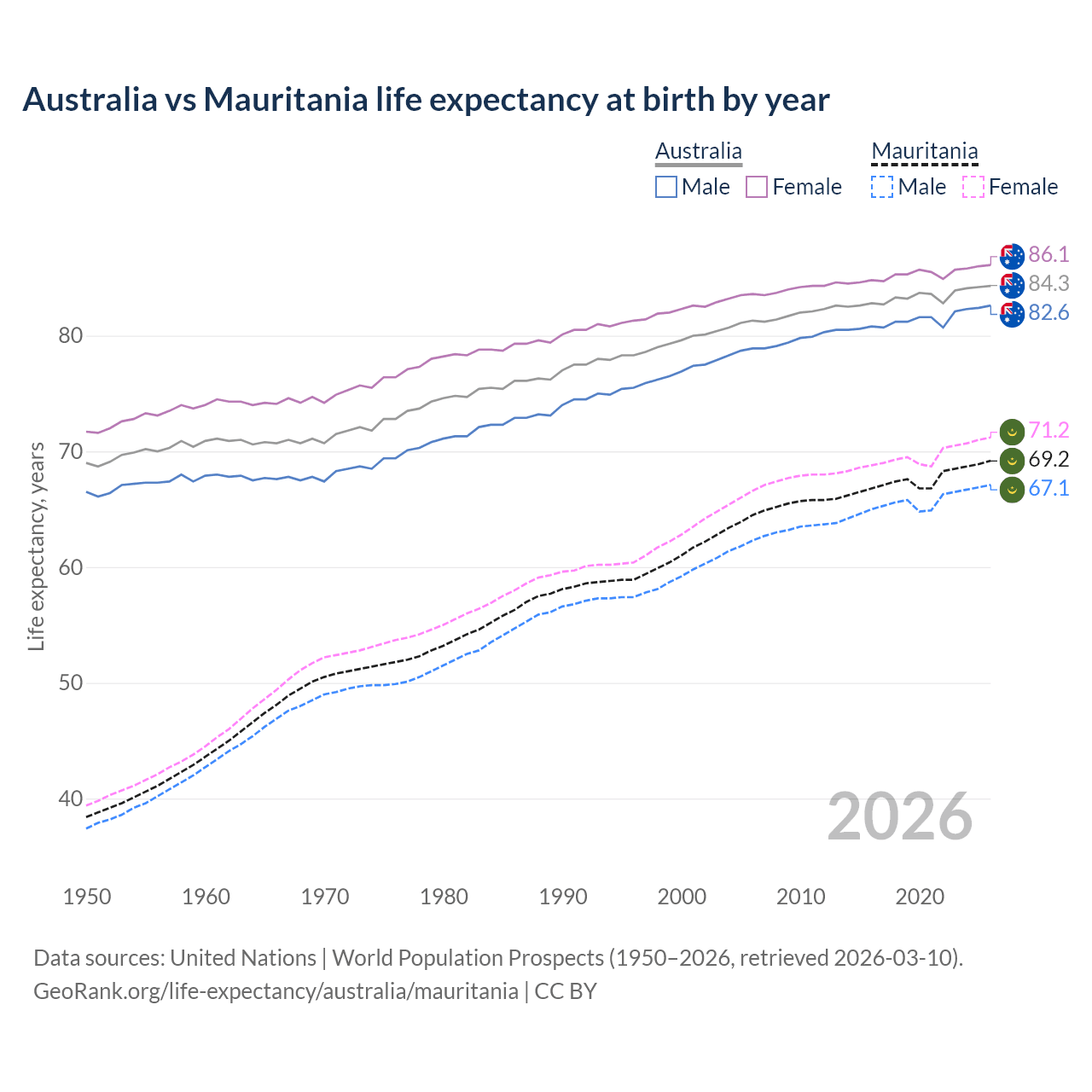 The average life expectancy at birth is 84.3 years in Australia vs 69.2 in Mauritania. Australia is ranked 7/197 by life expectancy, and Mauritania is 144/197. In Australia, the life expectancy is 82.6 years for males and 86.1 years for females. In Mauritania, it's 67.1 years for males and 71.2 years for females.