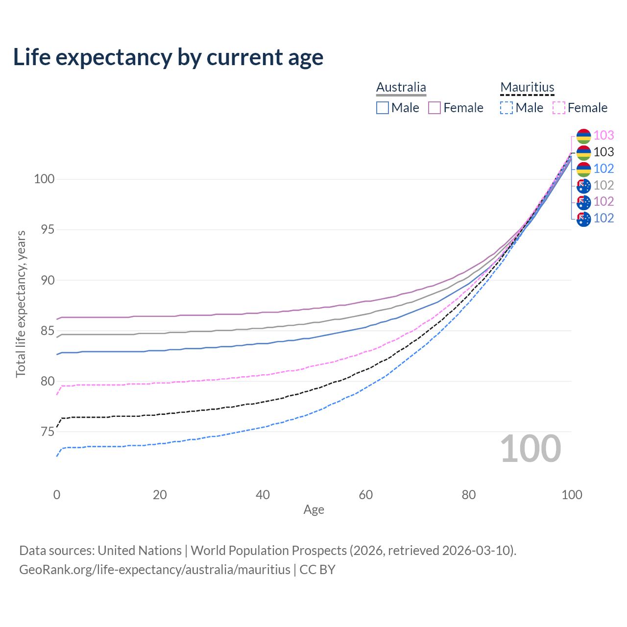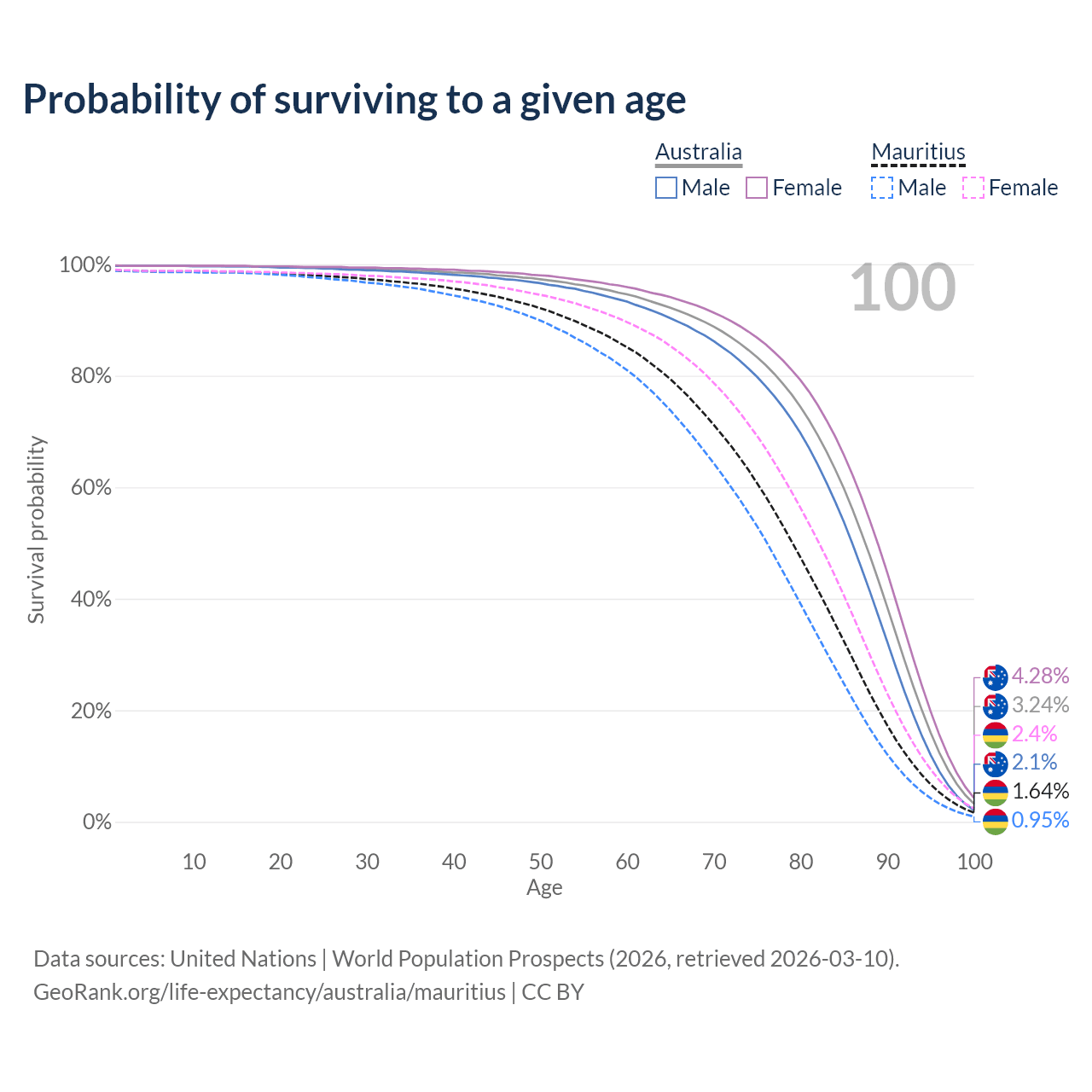 This life expectancy calculator shows the odds of living to 100, 95, 90, and below based on current age for both males and females in Australia and Mauritius, along with mean and median age of death. The calculations are based on the 2026 life tables (actuarial tables) from the UN World Population Prospects.