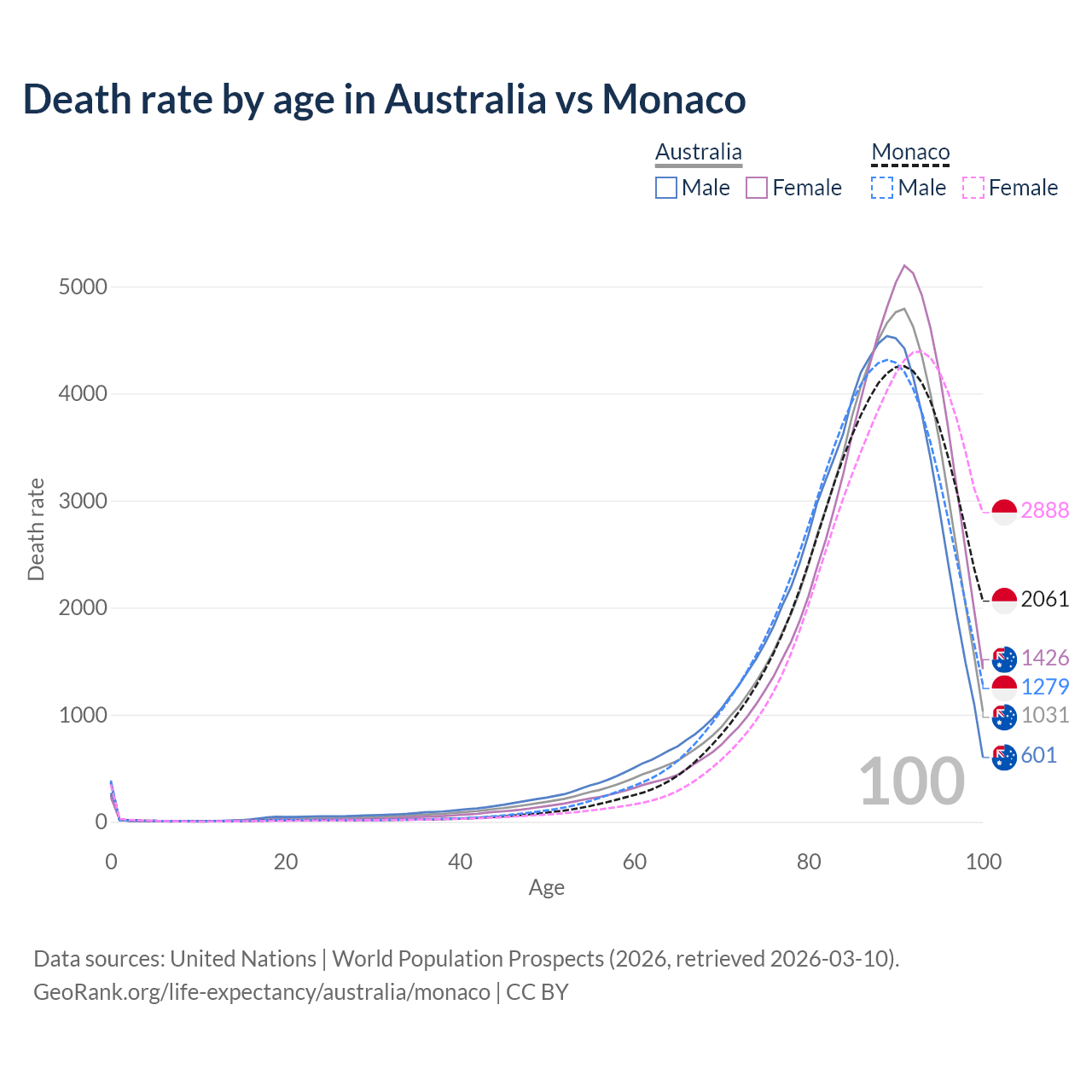 In Australia, the most common age of death is 91, compared to 91 in Monaco. The median age of death is 87.5 in Australia and 88.7 in Monaco, meaning only half of each cohort is expected to live past that age.