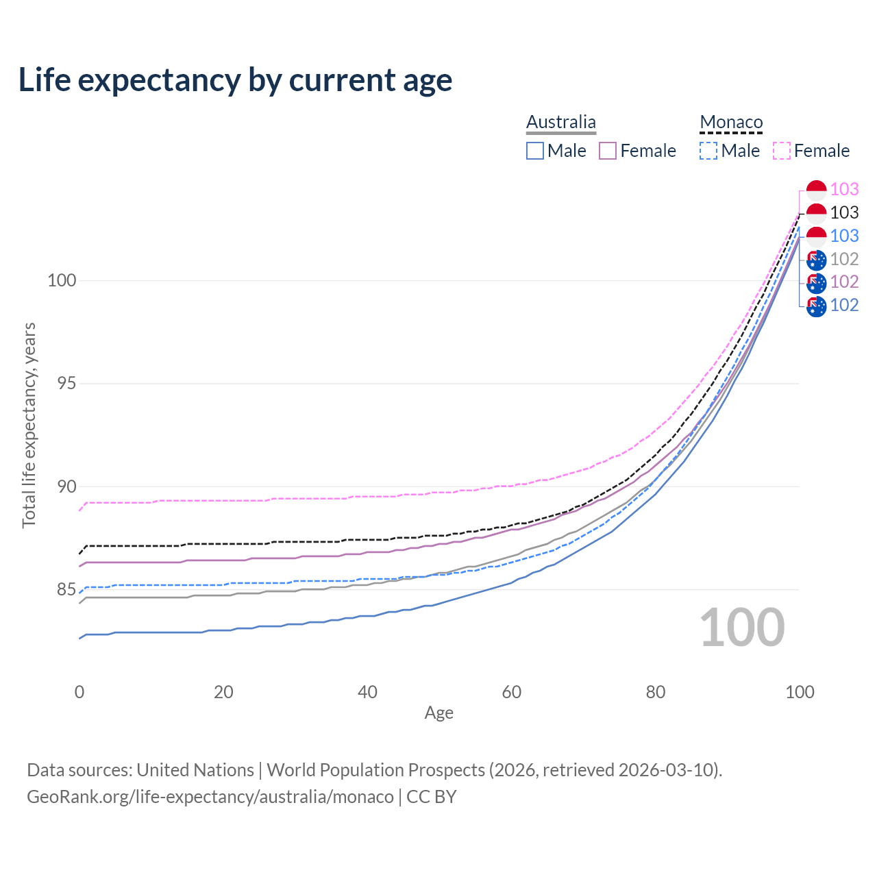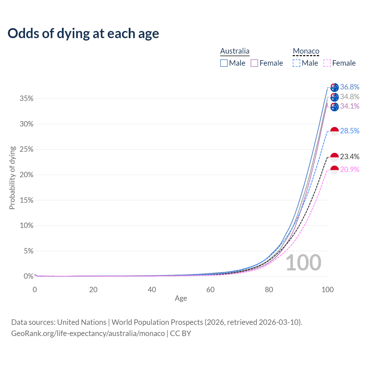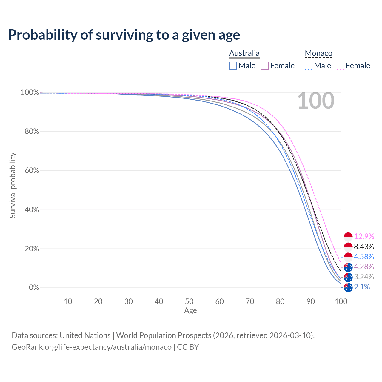 This life expectancy calculator shows the odds of living to 100, 95, 90, and below based on current age for both males and females in Australia and Monaco, along with mean and median age of death. The calculations are based on the 2026 life tables (actuarial tables) from the UN World Population Prospects.