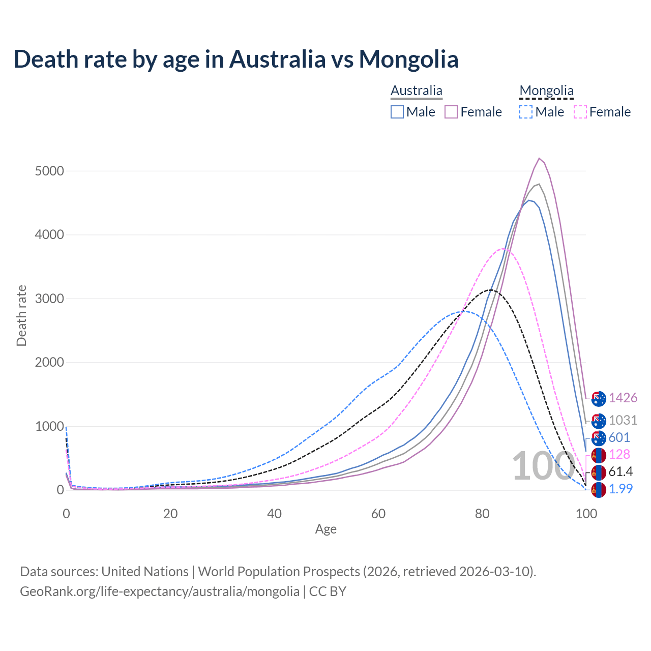 In Australia, the most common age of death is 91, compared to 82 in Mongolia. The median age of death is 87.5 in Australia and 76 in Mongolia, meaning only half of each cohort is expected to live past that age.