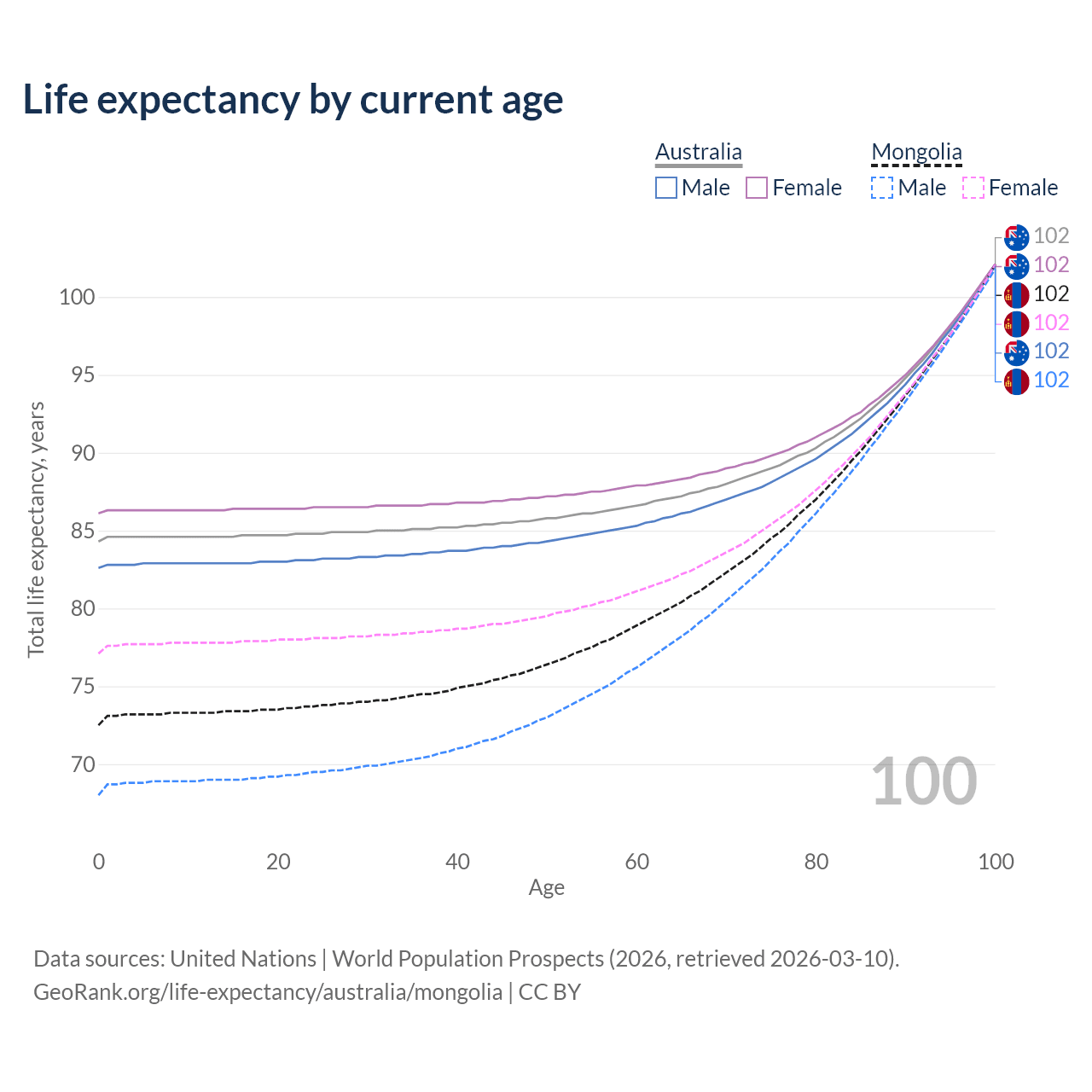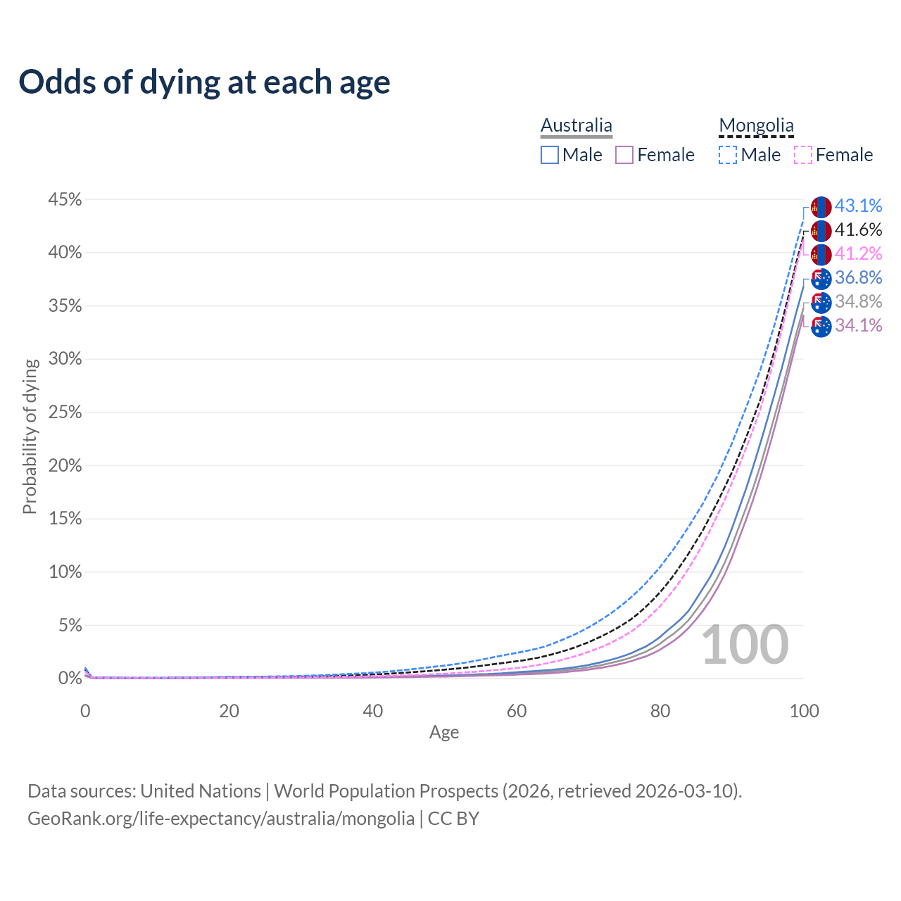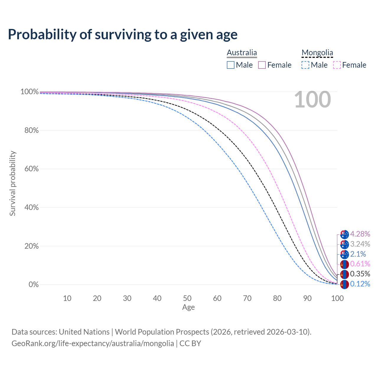 This life expectancy calculator shows the odds of living to 100, 95, 90, and below based on current age for both males and females in Australia and Mongolia, along with mean and median age of death. The calculations are based on the 2026 life tables (actuarial tables) from the UN World Population Prospects.