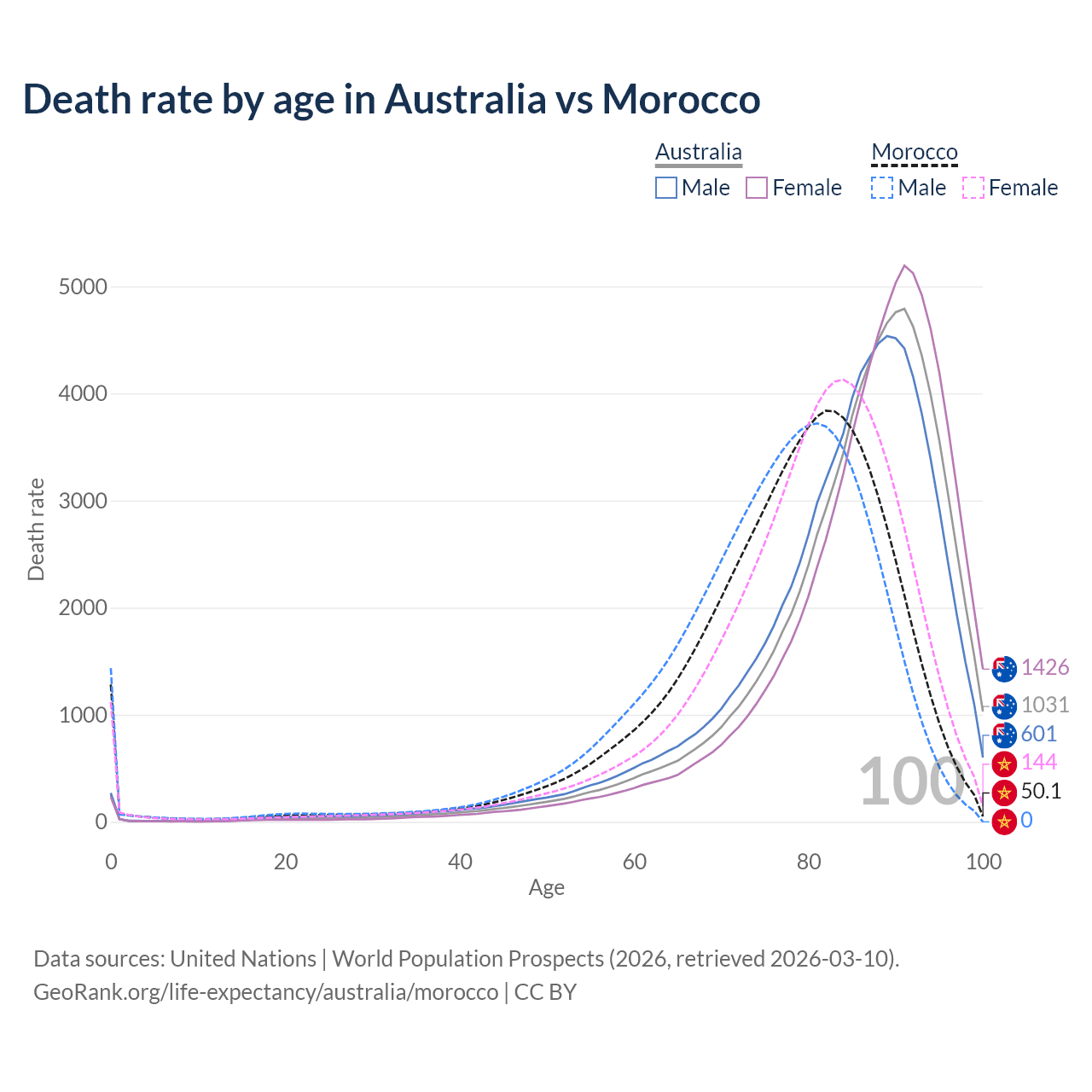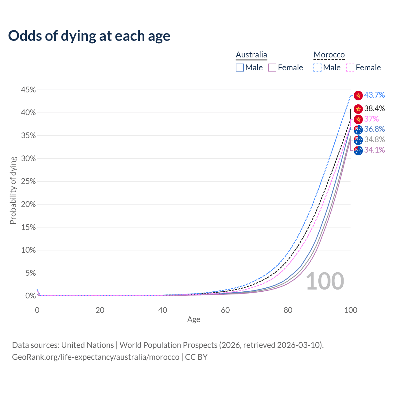 This life expectancy calculator shows the odds of living to 100, 95, 90, and below based on current age for both males and females in Australia and Morocco, along with mean and median age of death. The calculations are based on the 2026 life tables (actuarial tables) from the UN World Population Prospects.