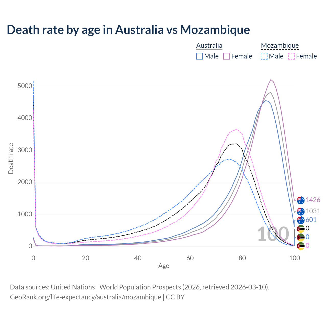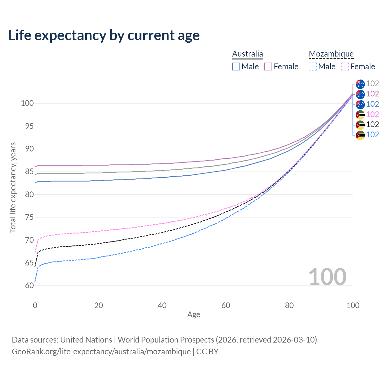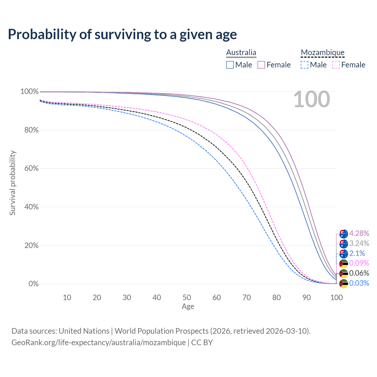 This life expectancy calculator shows the odds of living to 100, 95, 90, and below based on current age for both males and females in Australia and Mozambique, along with mean and median age of death. The calculations are based on the 2026 life tables (actuarial tables) from the UN World Population Prospects.