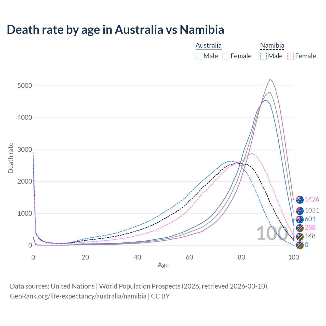 In Australia, the most common age of death is 91, compared to 0 in Namibia. The median age of death is 87.5 in Australia and 72.7 in Namibia, meaning only half of each cohort is expected to live past that age.