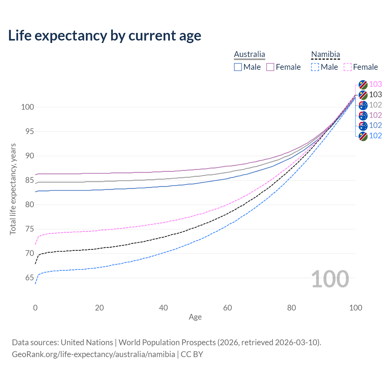 This life expectancy calculator shows the odds of living to 100, 95, 90, and below based on current age for both males and females in Australia and Namibia, along with mean and median age of death. The calculations are based on the 2026 life tables (actuarial tables) from the UN World Population Prospects.