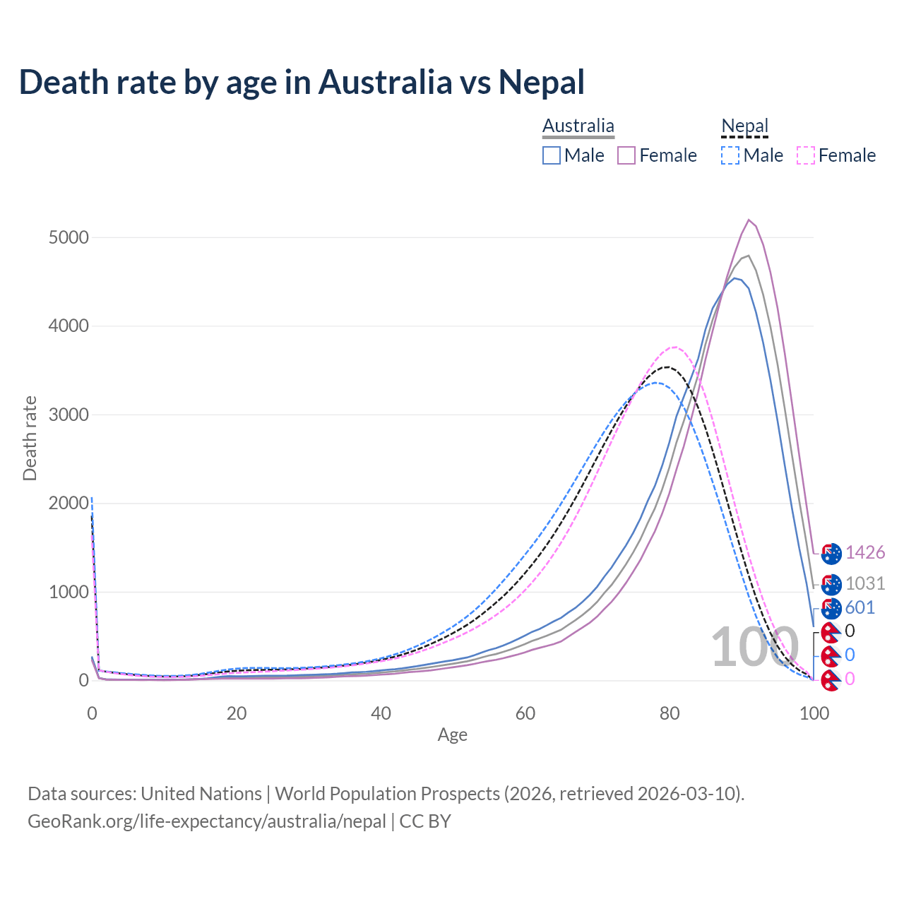 In Australia, the most common age of death is 91, compared to 80 in Nepal. The median age of death is 87.5 in Australia and 75.4 in Nepal, meaning only half of each cohort is expected to live past that age.