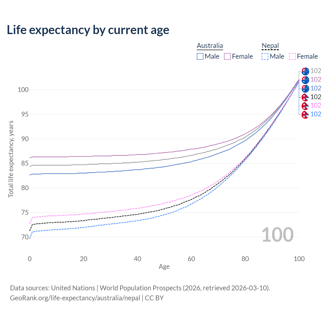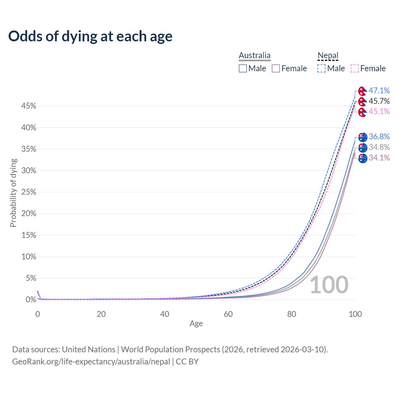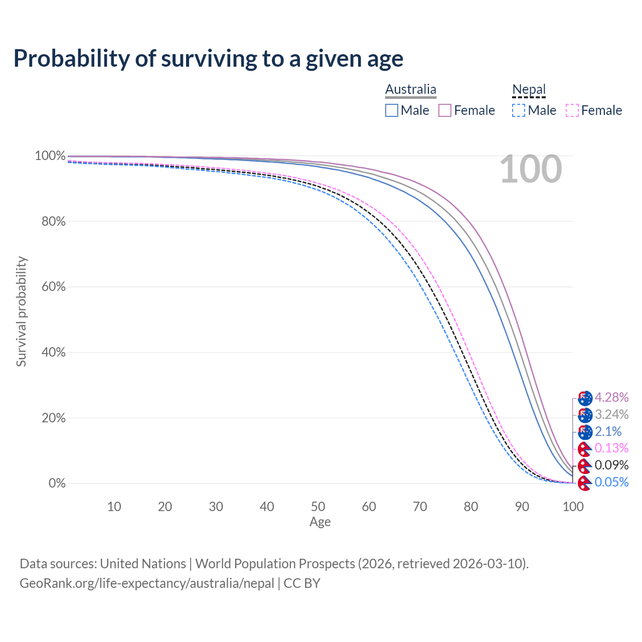 This life expectancy calculator shows the odds of living to 100, 95, 90, and below based on current age for both males and females in Australia and Nepal, along with mean and median age of death. The calculations are based on the 2026 life tables (actuarial tables) from the UN World Population Prospects.
