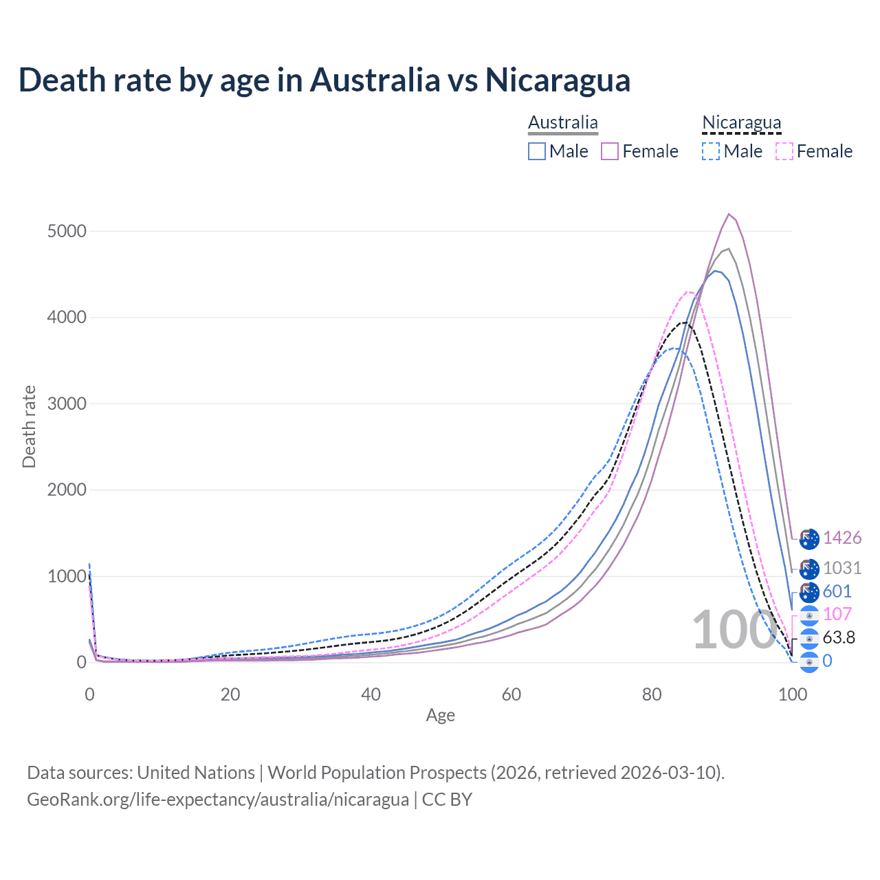 In Australia, the most common age of death is 91, compared to 85 in Nicaragua. The median age of death is 87.5 in Australia and 79.9 in Nicaragua, meaning only half of each cohort is expected to live past that age.