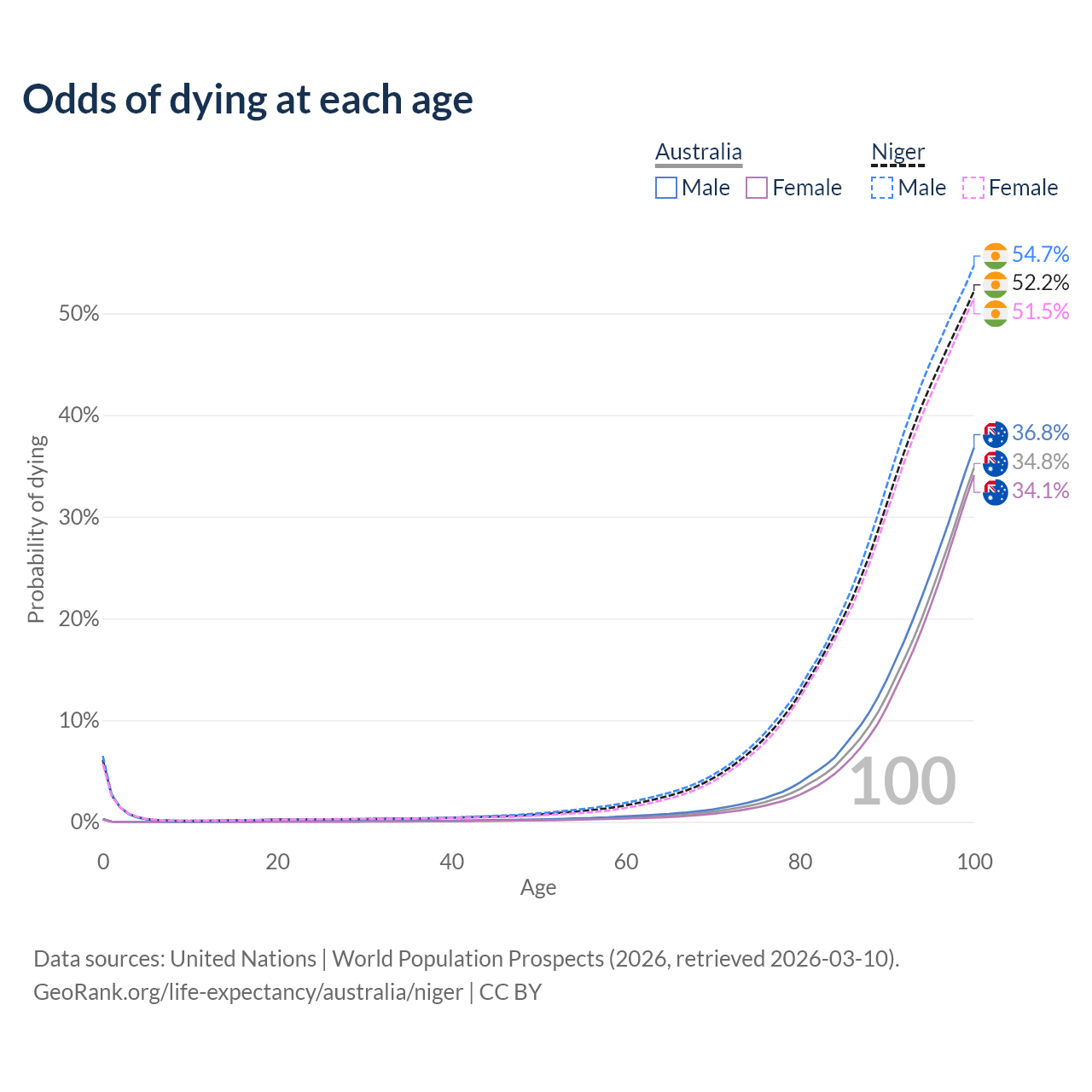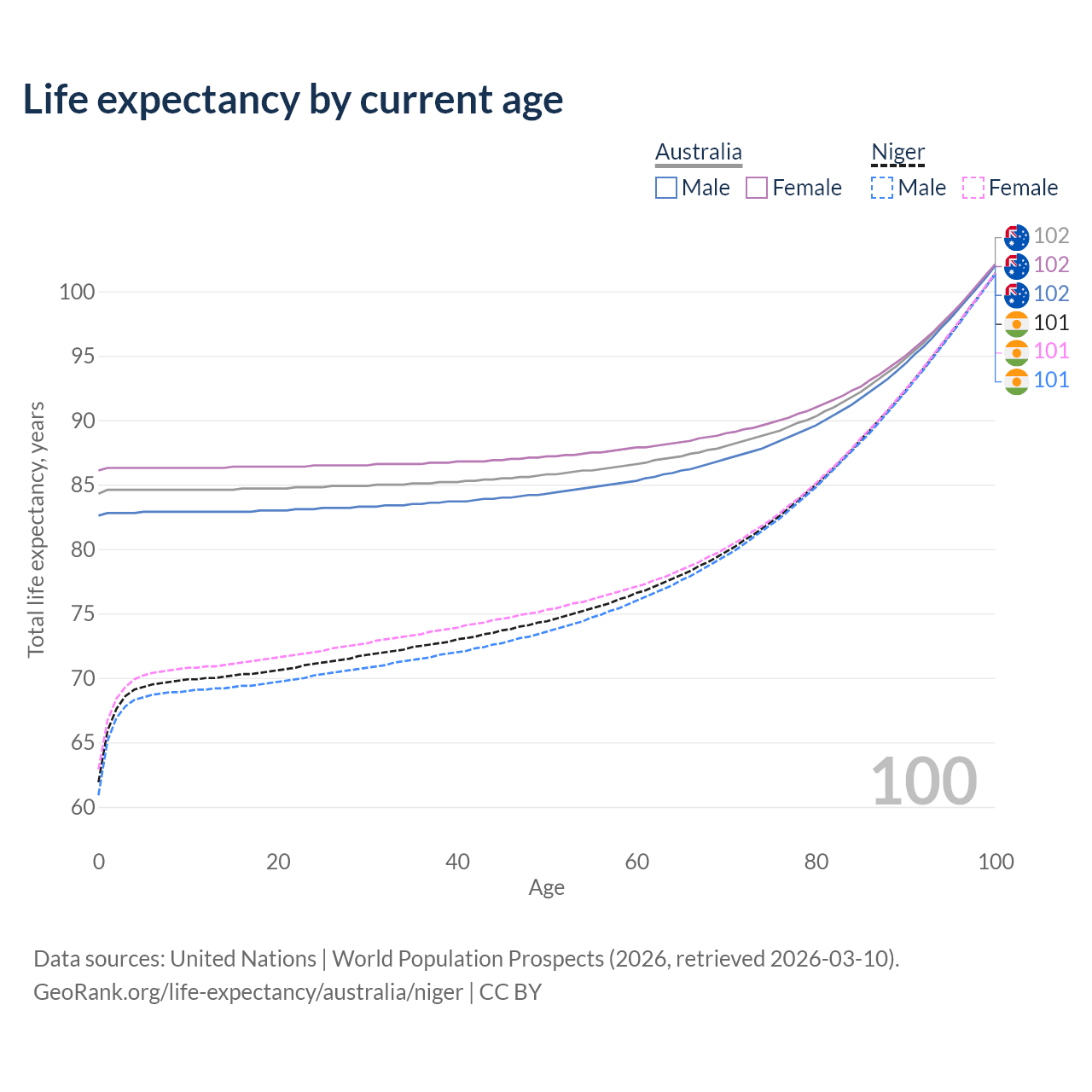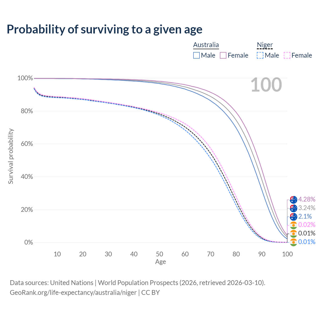 This life expectancy calculator shows the odds of living to 100, 95, 90, and below based on current age for both males and females in Australia and Niger, along with mean and median age of death. The calculations are based on the 2026 life tables (actuarial tables) from the UN World Population Prospects.
