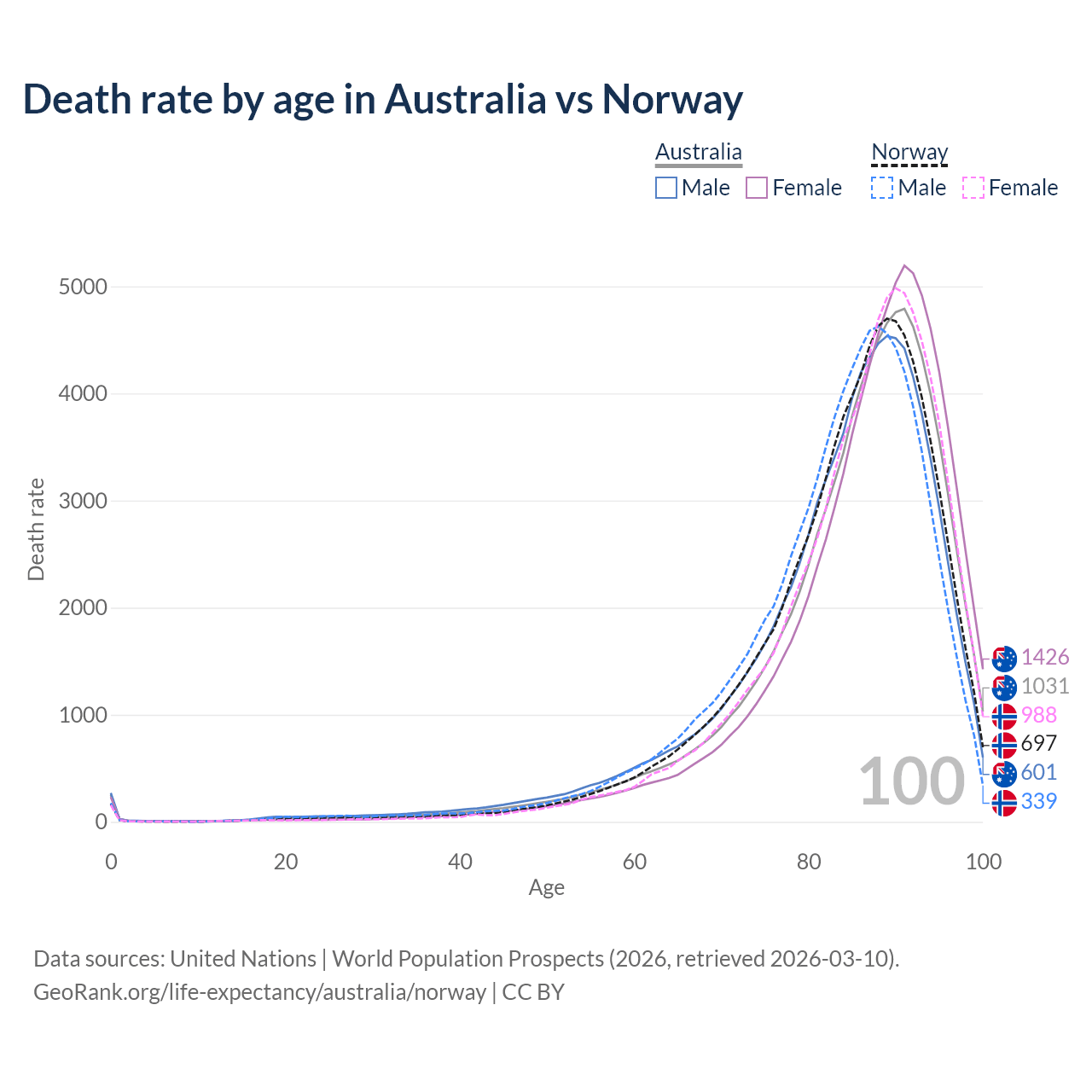 In Australia, the most common age of death is 91, compared to 89 in Norway. The median age of death is 87.5 in Australia and 86.5 in Norway, meaning only half of each cohort is expected to live past that age.