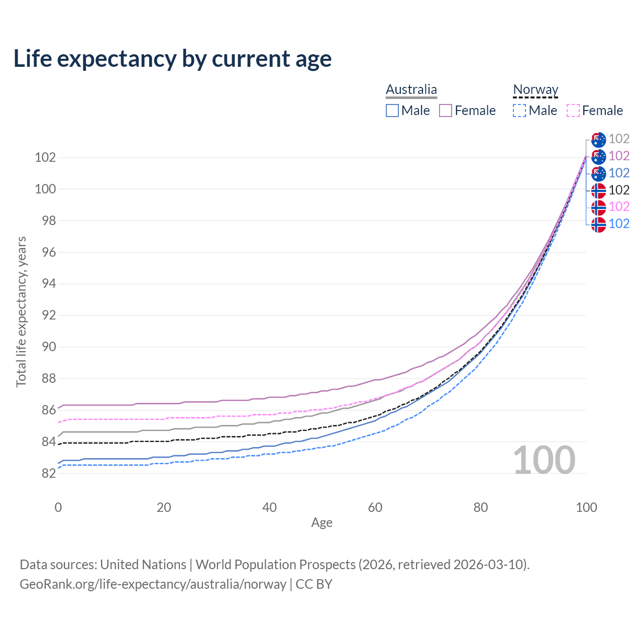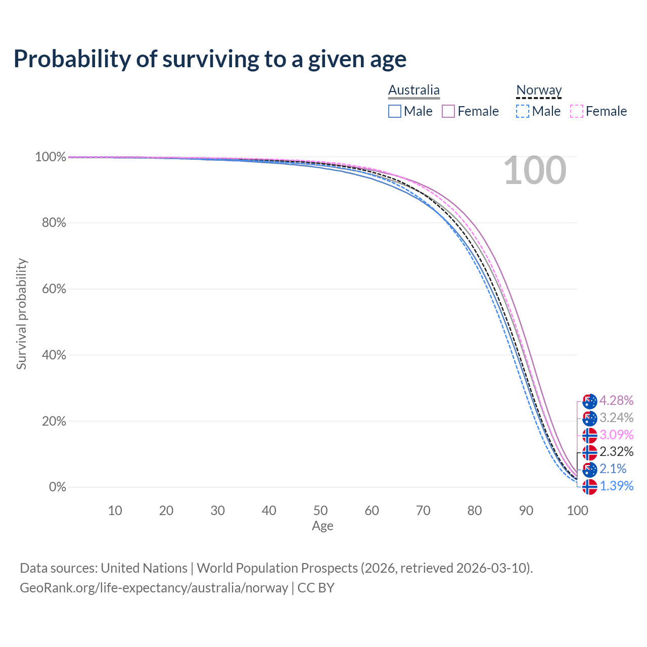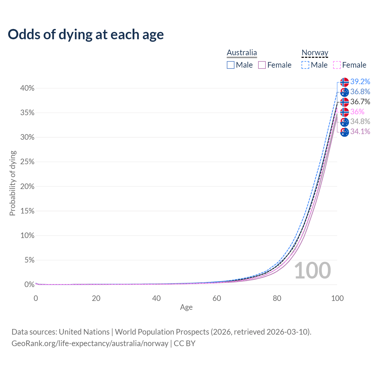 This life expectancy calculator shows the odds of living to 100, 95, 90, and below based on current age for both males and females in Australia and Norway, along with mean and median age of death. The calculations are based on the 2026 life tables (actuarial tables) from the UN World Population Prospects.