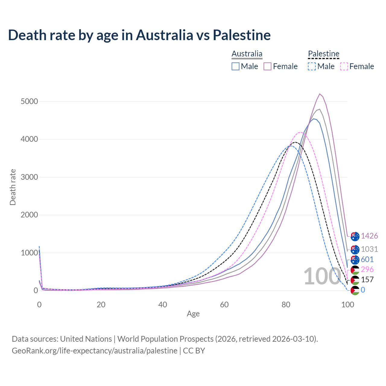 In Australia, the most common age of death is 91, compared to 83 in Palestine. The median age of death is 87.5 in Australia and 80.5 in Palestine, meaning only half of each cohort is expected to live past that age.