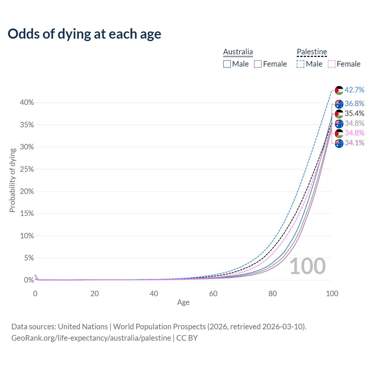 This life expectancy calculator shows the odds of living to 100, 95, 90, and below based on current age for both males and females in Australia and Palestine, along with mean and median age of death. The calculations are based on the 2026 life tables (actuarial tables) from the UN World Population Prospects.