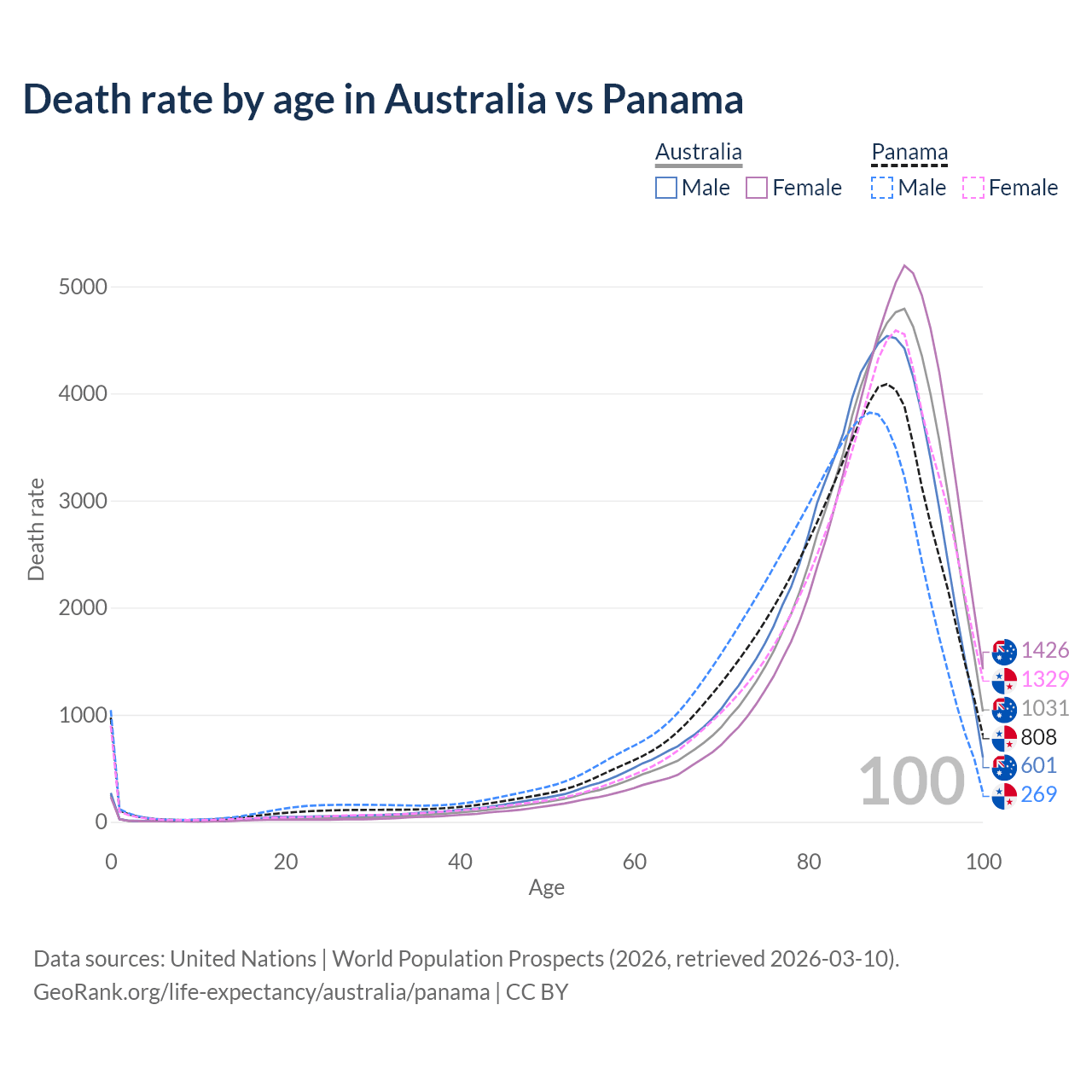 In Australia, the most common age of death is 91, compared to 89 in Panama. The median age of death is 87.5 in Australia and 84.6 in Panama, meaning only half of each cohort is expected to live past that age.
