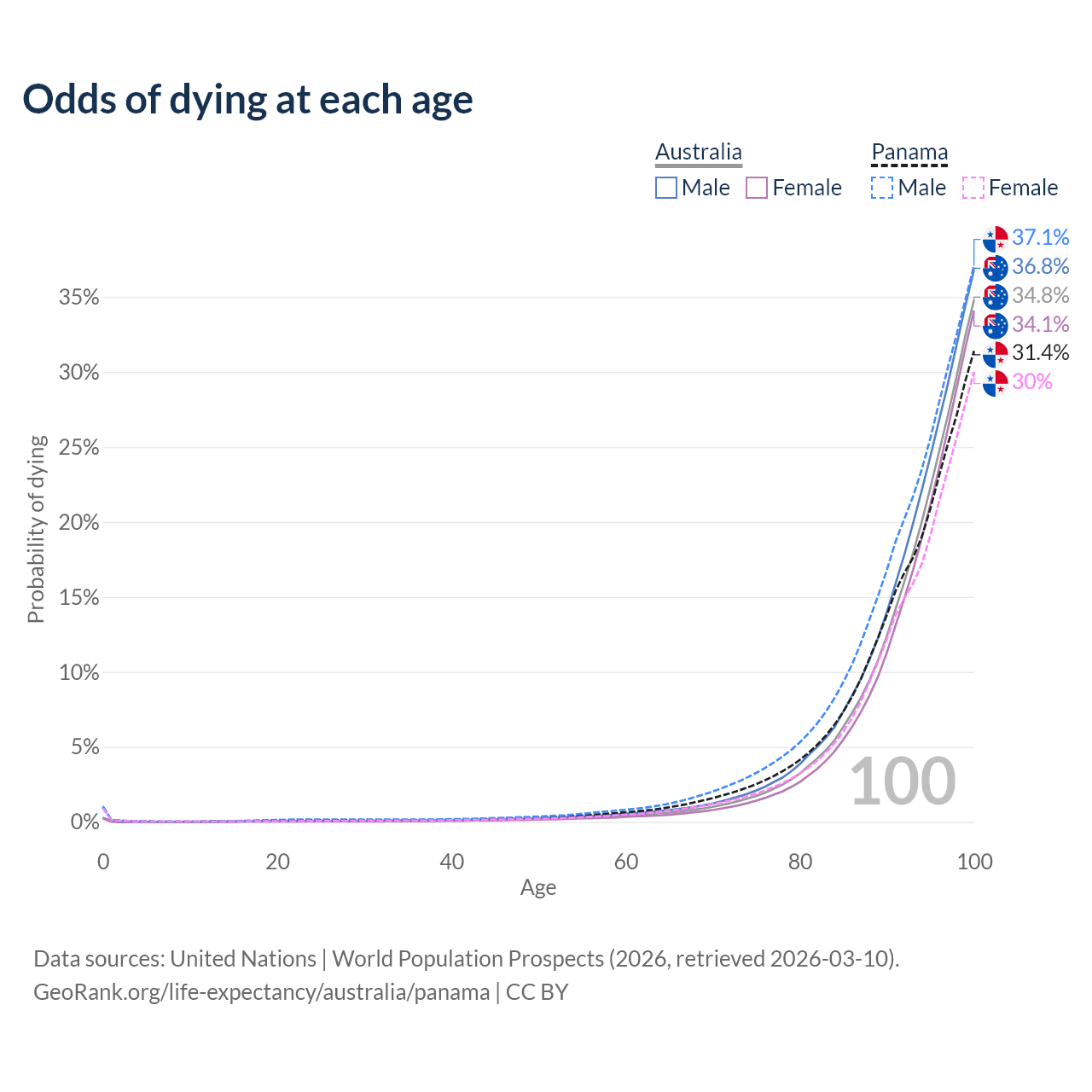 This life expectancy calculator shows the odds of living to 100, 95, 90, and below based on current age for both males and females in Australia and Panama, along with mean and median age of death. The calculations are based on the 2026 life tables (actuarial tables) from the UN World Population Prospects.