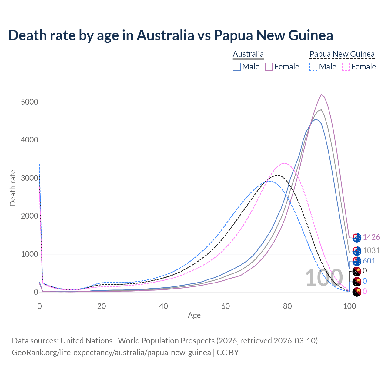 In Australia, the most common age of death is 91, compared to 0 in Papua New Guinea. The median age of death is 87.5 in Australia and 71.7 in Papua New Guinea, meaning only half of each cohort is expected to live past that age.