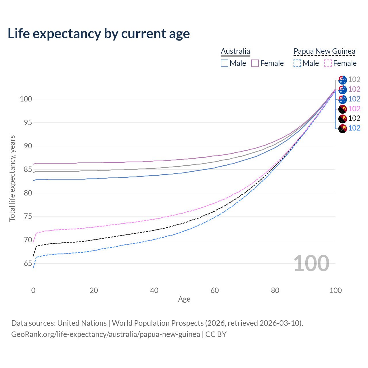 The average life expectancy at birth is 84.3 years in Australia vs 66.5 in Papua New Guinea. Australia is ranked 7/197 by life expectancy, and Papua New Guinea is 166/197. In Australia, the life expectancy is 82.6 years for males and 86.1 years for females. In Papua New Guinea, it's 64 years for males and 69.5 years for females.