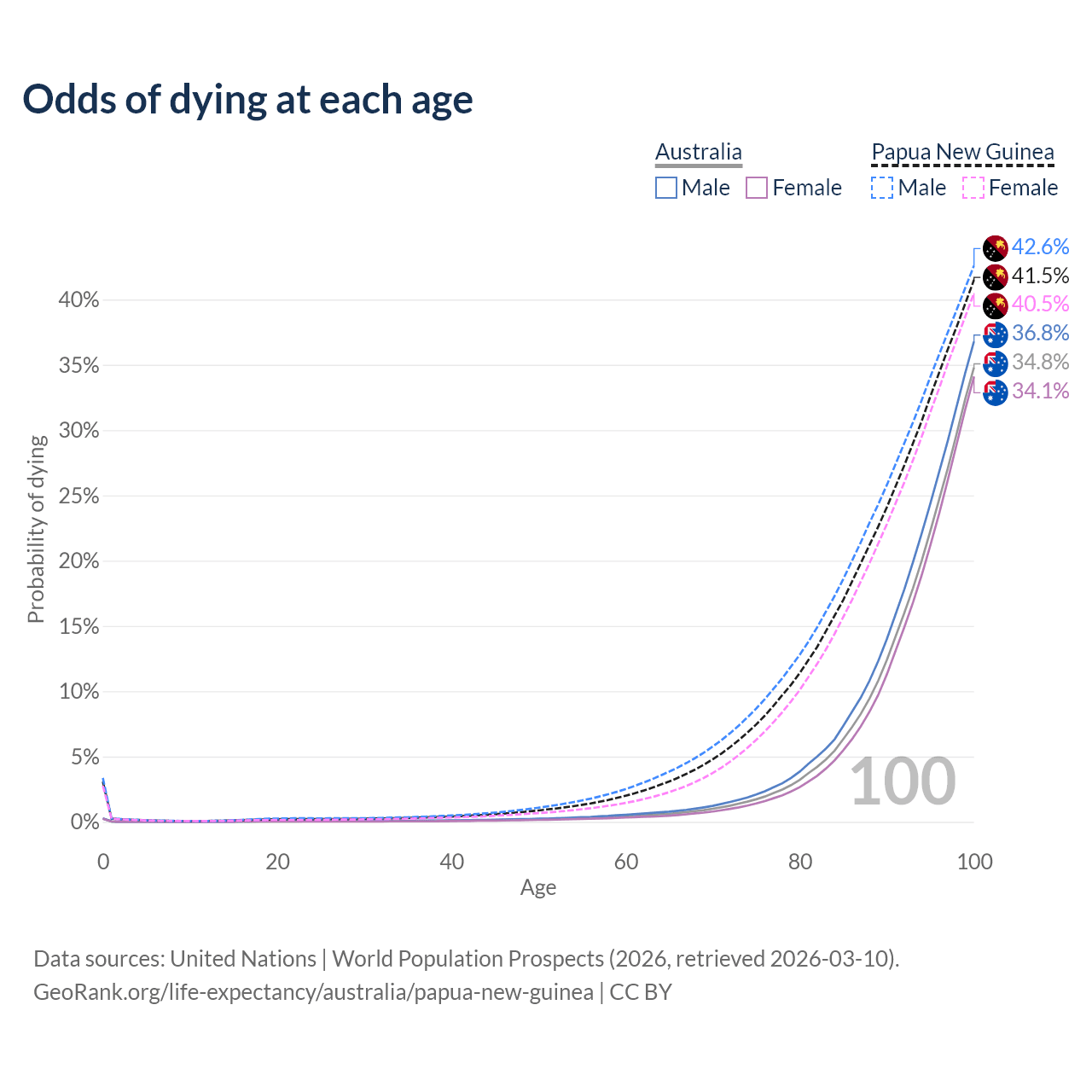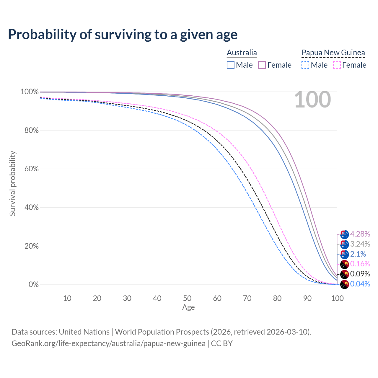This life expectancy calculator shows the odds of living to 100, 95, 90, and below based on current age for both males and females in Australia and Papua New Guinea, along with mean and median age of death. The calculations are based on the 2026 life tables (actuarial tables) from the UN World Population Prospects.