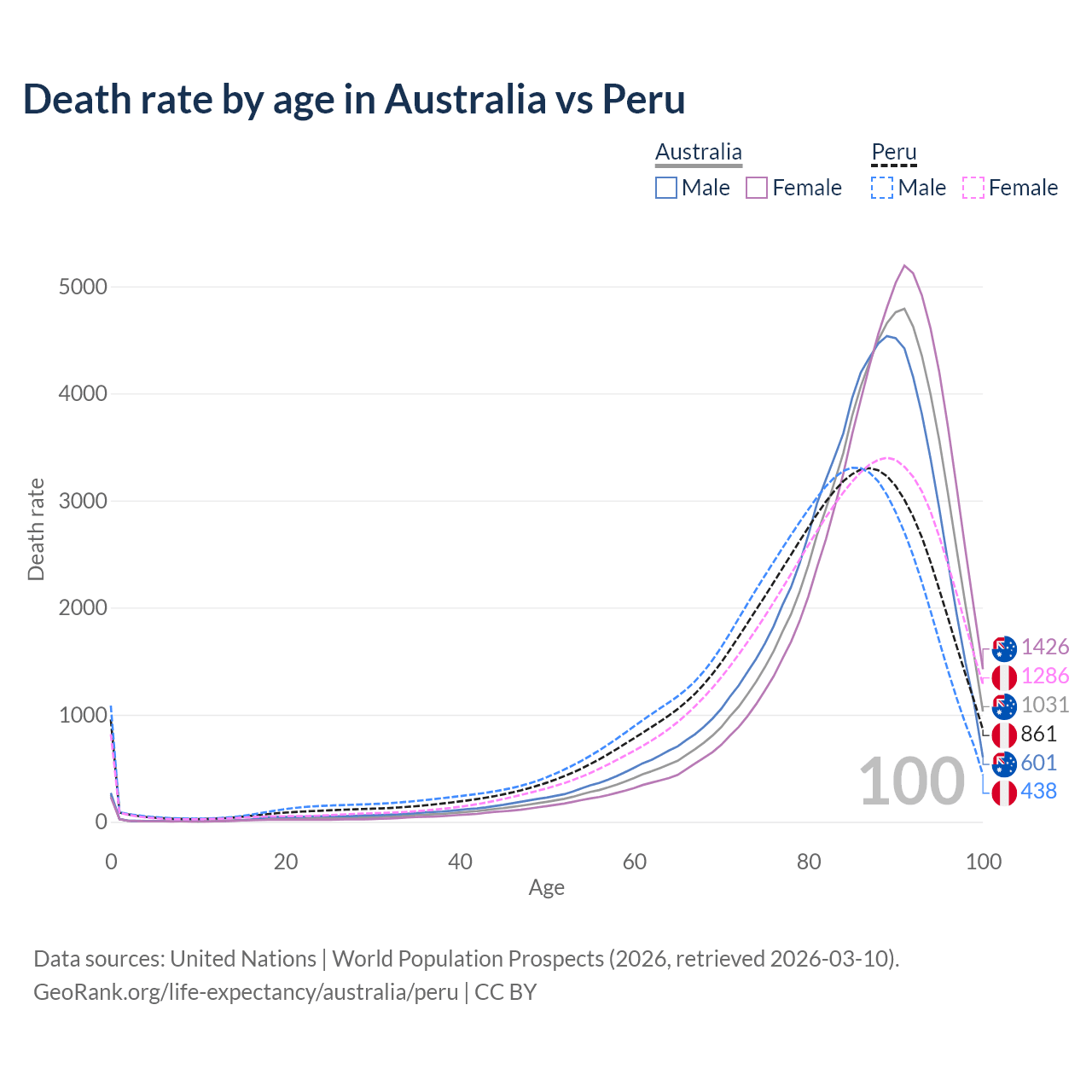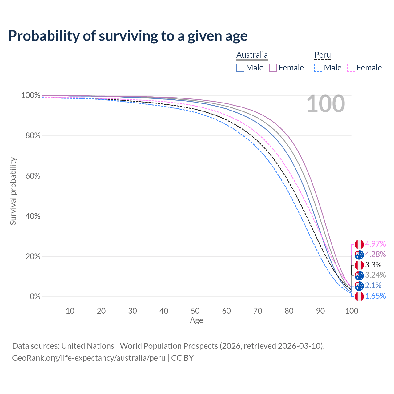 This life expectancy calculator shows the odds of living to 100, 95, 90, and below based on current age for both males and females in Australia and Peru, along with mean and median age of death. The calculations are based on the 2026 life tables (actuarial tables) from the UN World Population Prospects.