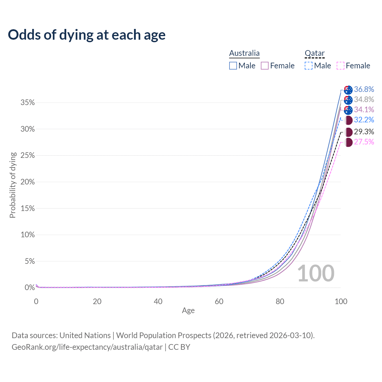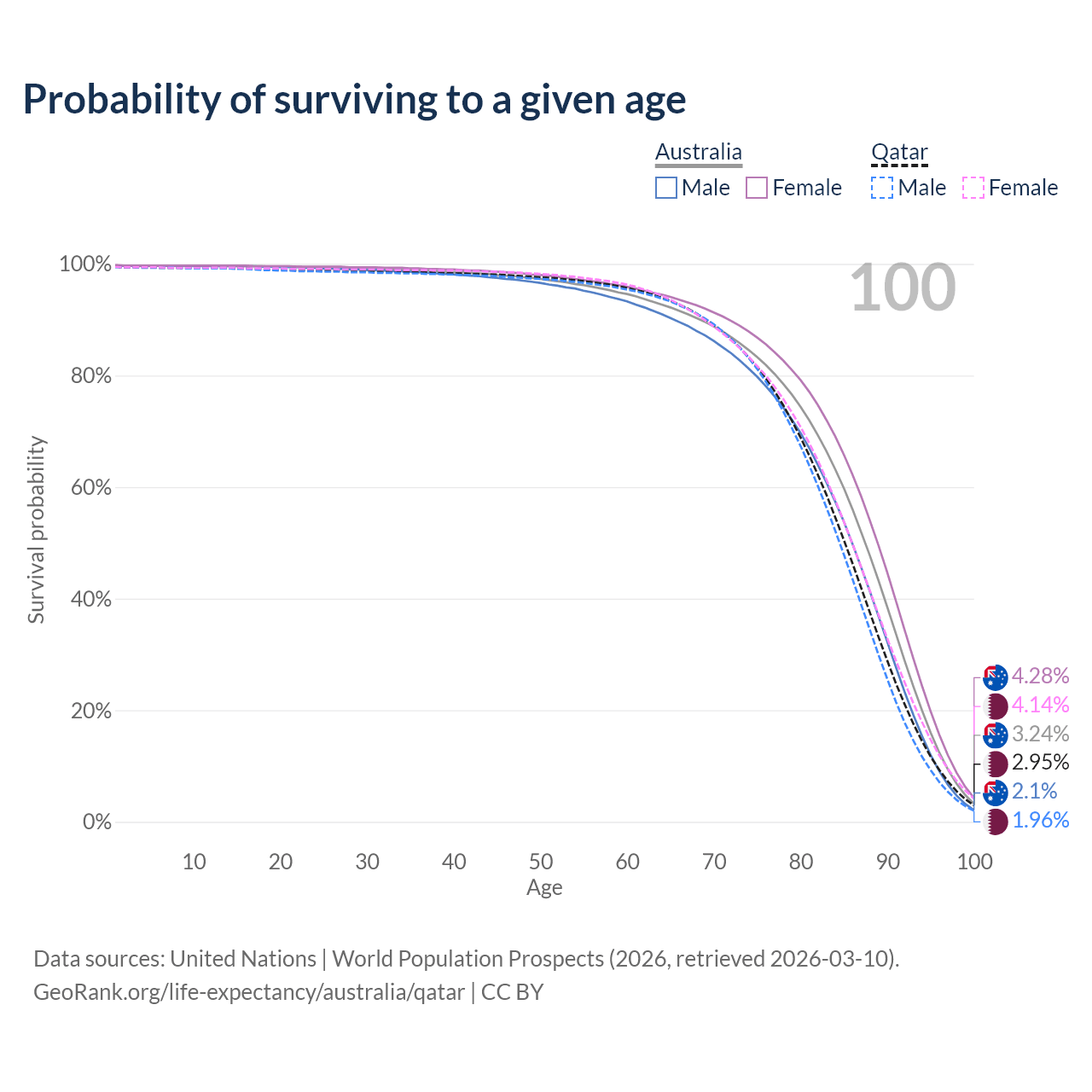 This life expectancy calculator shows the odds of living to 100, 95, 90, and below based on current age for both males and females in Australia and Qatar, along with mean and median age of death. The calculations are based on the 2026 life tables (actuarial tables) from the UN World Population Prospects.