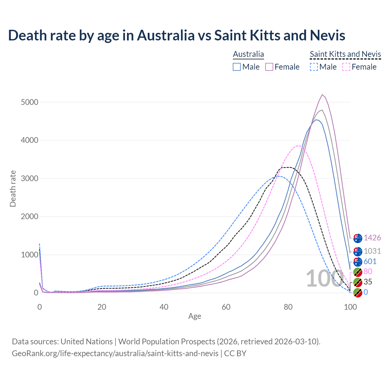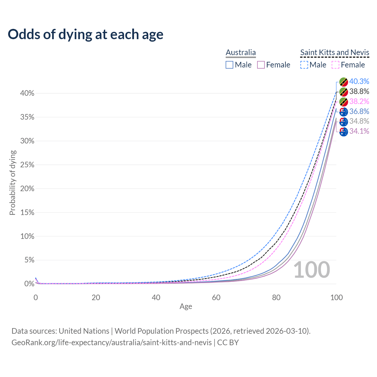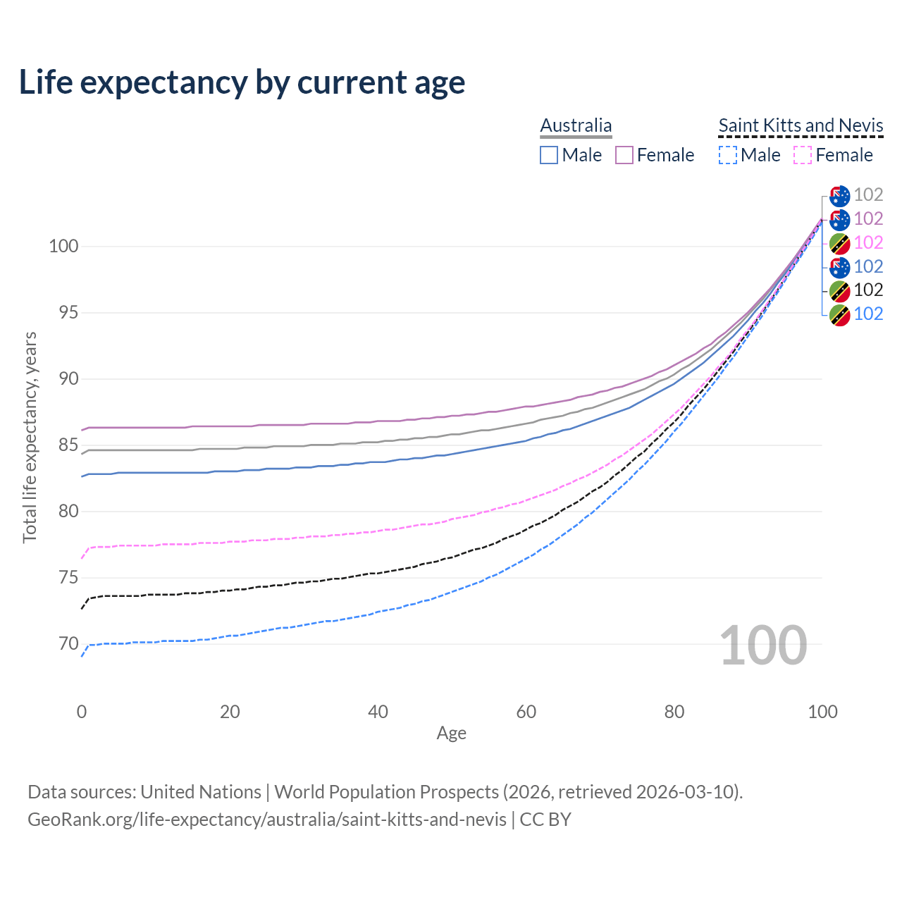 This life expectancy calculator shows the odds of living to 100, 95, 90, and below based on current age for both males and females in Australia and Saint Kitts and Nevis, along with mean and median age of death. The calculations are based on the 2026 life tables (actuarial tables) from the UN World Population Prospects.