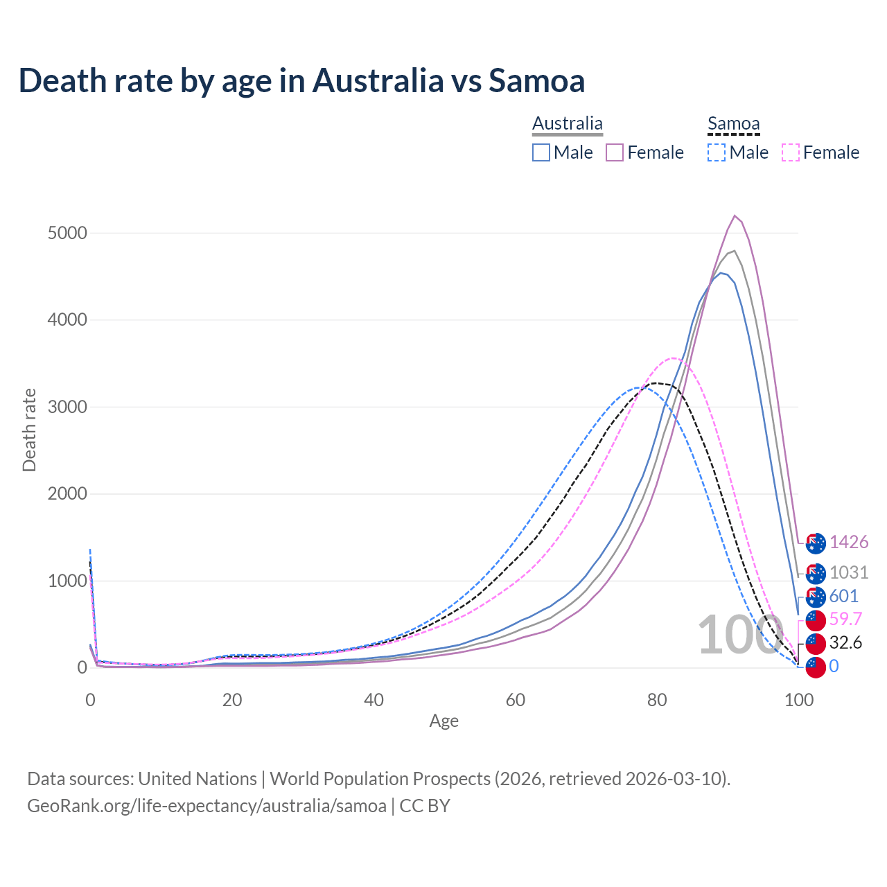 In Australia, the most common age of death is 91, compared to 80 in Samoa. The median age of death is 87.5 in Australia and 75.9 in Samoa, meaning only half of each cohort is expected to live past that age.
