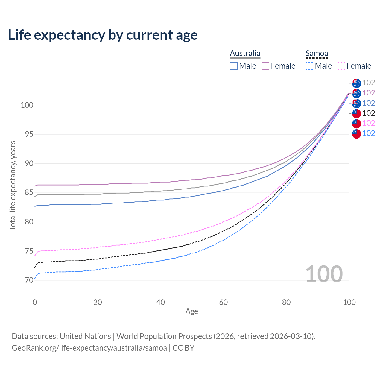 The average life expectancy at birth is 84.3 years in Australia vs 72.1 in Samoa. Australia is ranked 7/197 by life expectancy, and Samoa is 124/197. In Australia, the life expectancy is 82.6 years for males and 86.1 years for females. In Samoa, it's 70.2 years for males and 74.1 years for females.