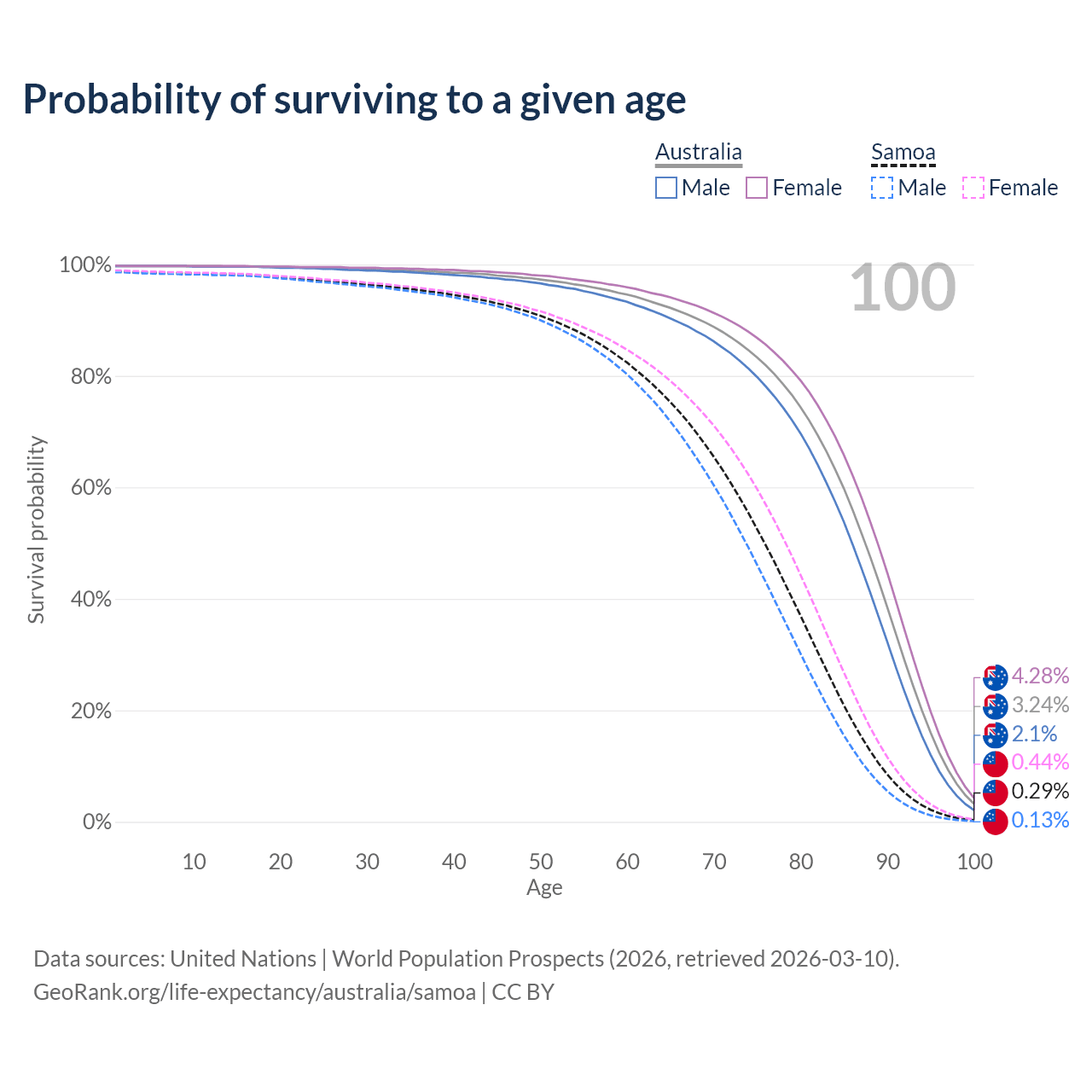 This life expectancy calculator shows the odds of living to 100, 95, 90, and below based on current age for both males and females in Australia and Samoa, along with mean and median age of death. The calculations are based on the 2026 life tables (actuarial tables) from the UN World Population Prospects.