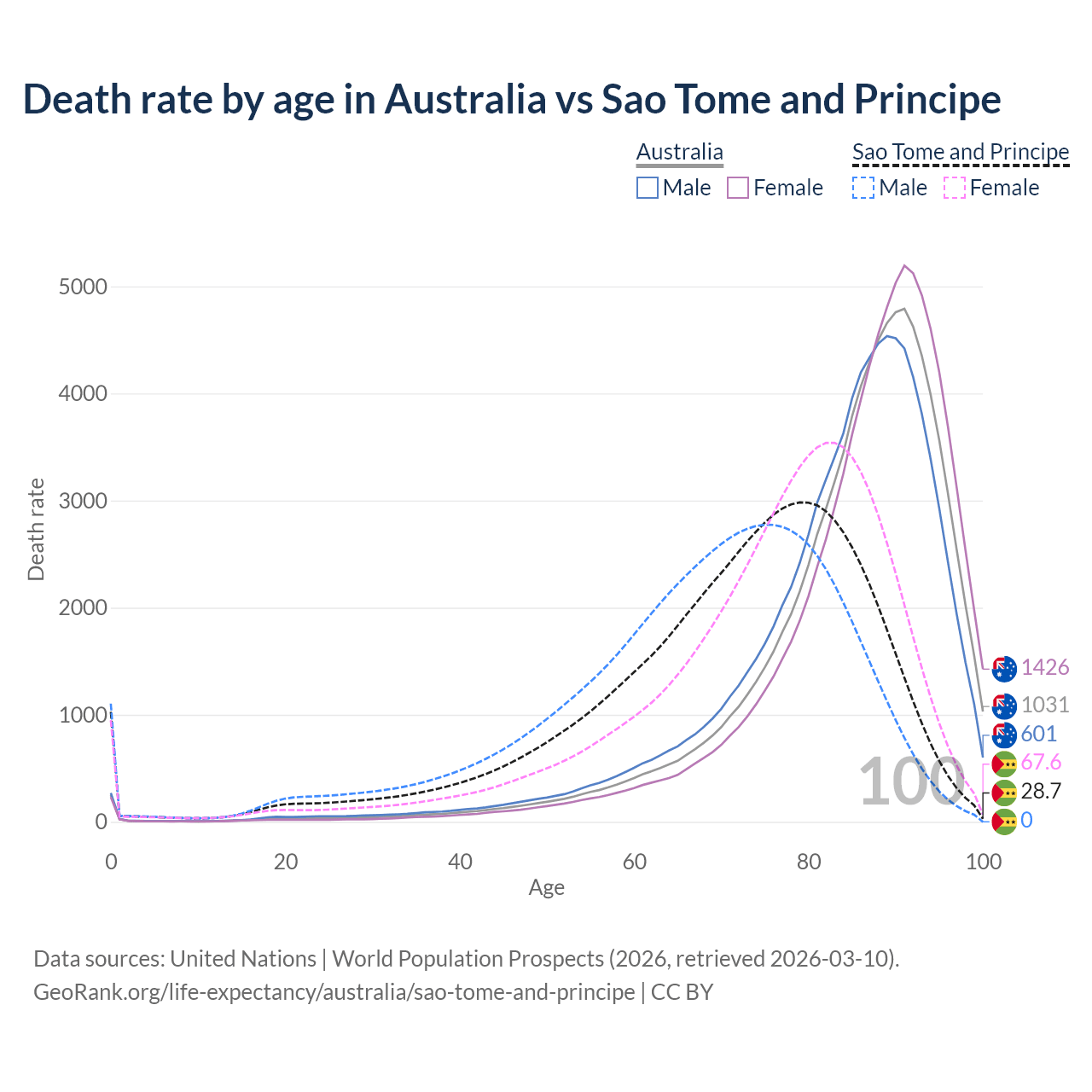 In Australia, the most common age of death is 91, compared to 79 in Sao Tome and Principe. The median age of death is 87.5 in Australia and 74.1 in Sao Tome and Principe, meaning only half of each cohort is expected to live past that age.