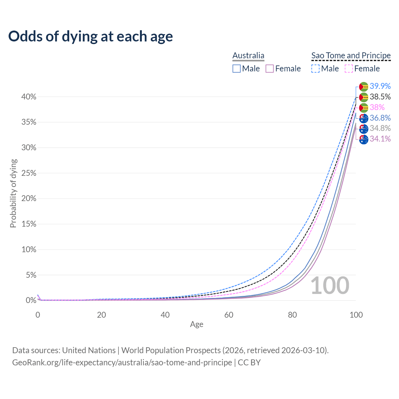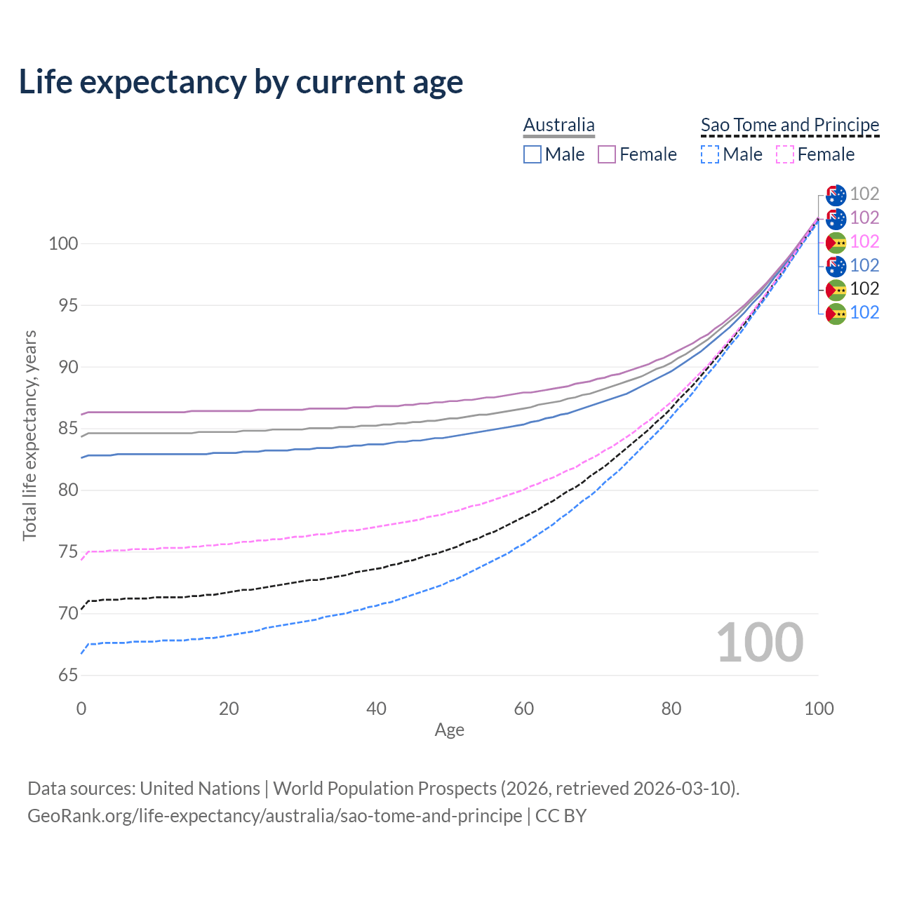 This life expectancy calculator shows the odds of living to 100, 95, 90, and below based on current age for both males and females in Australia and Sao Tome and Principe, along with mean and median age of death. The calculations are based on the 2026 life tables (actuarial tables) from the UN World Population Prospects.