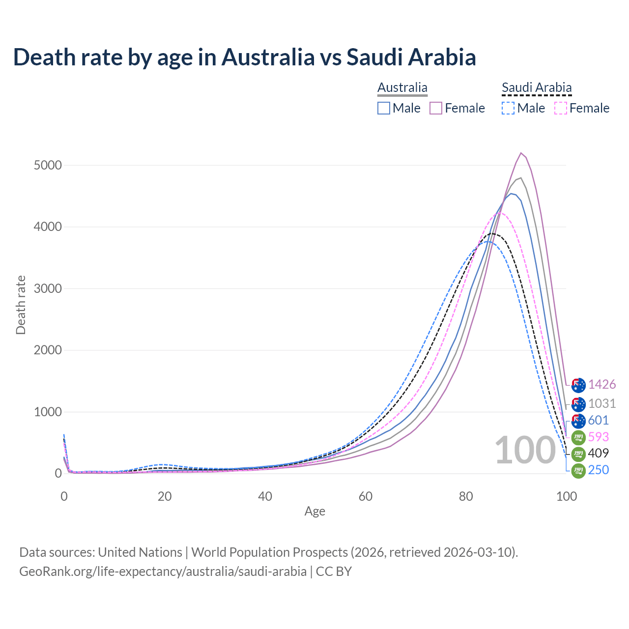 In Australia, the most common age of death is 91, compared to 85 in Saudi Arabia. The median age of death is 87.5 in Australia and 82.5 in Saudi Arabia, meaning only half of each cohort is expected to live past that age.