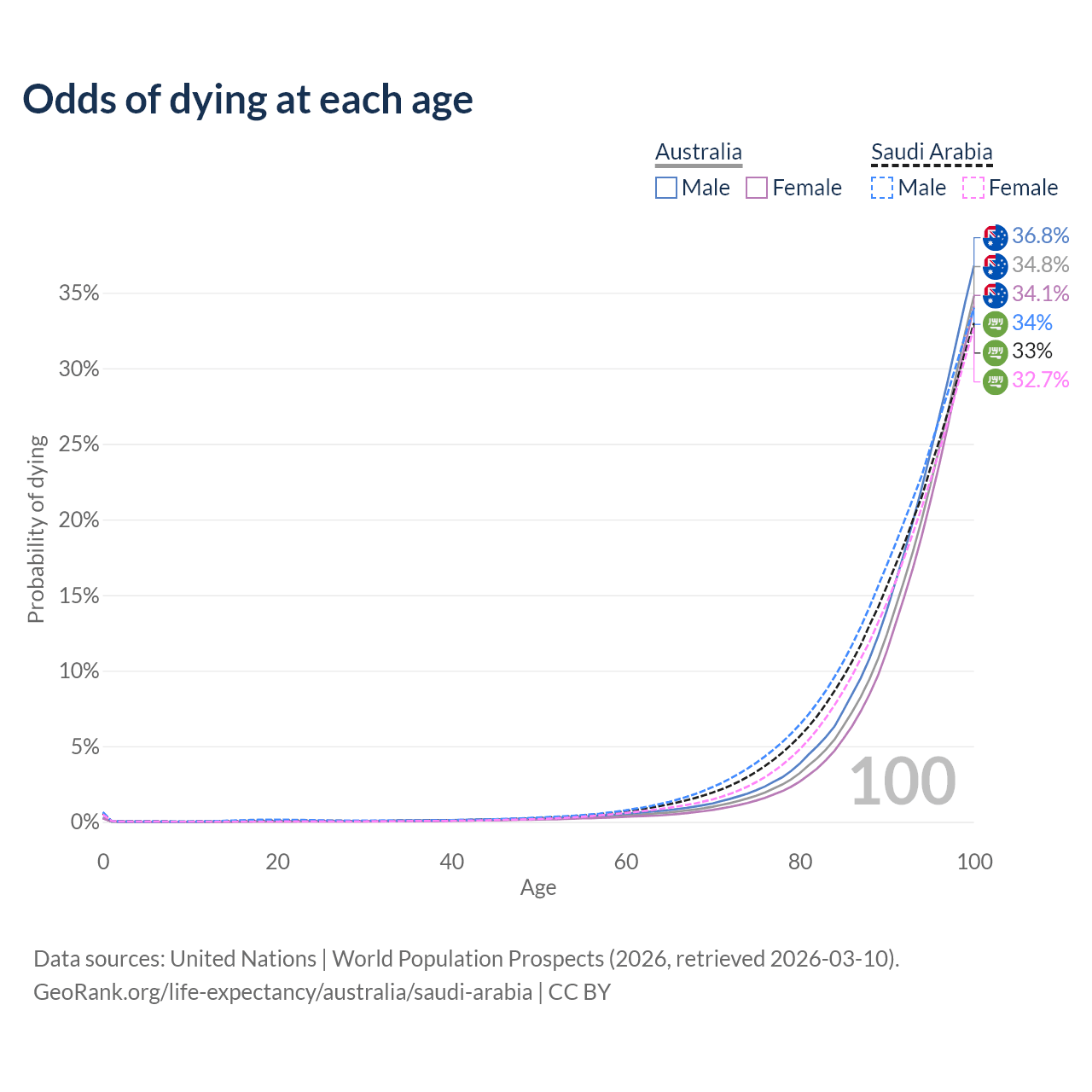 This life expectancy calculator shows the odds of living to 100, 95, 90, and below based on current age for both males and females in Australia and Saudi Arabia, along with mean and median age of death. The calculations are based on the 2026 life tables (actuarial tables) from the UN World Population Prospects.
