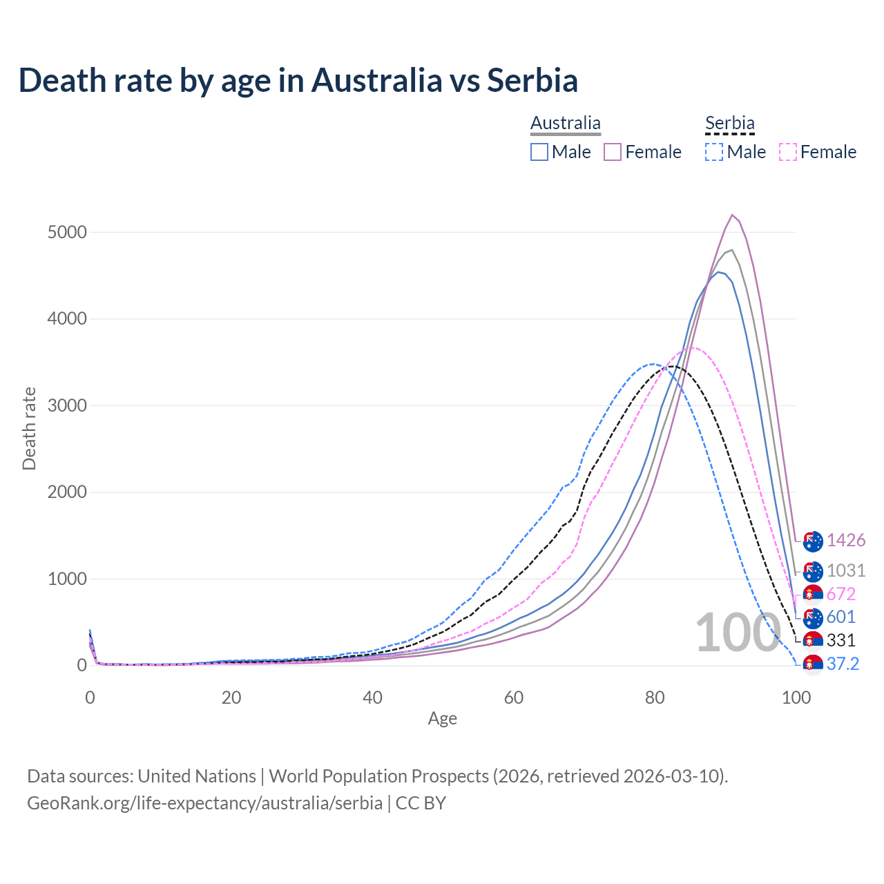 In Australia, the most common age of death is 91, compared to 83 in Serbia. The median age of death is 87.5 in Australia and 79.6 in Serbia, meaning only half of each cohort is expected to live past that age.