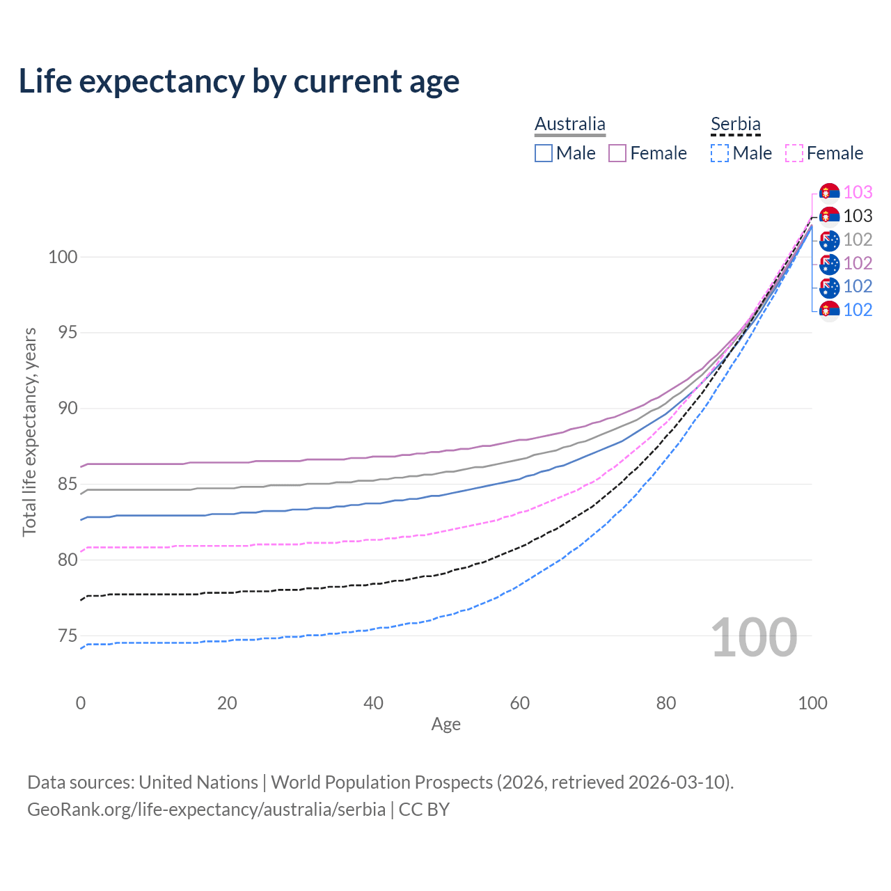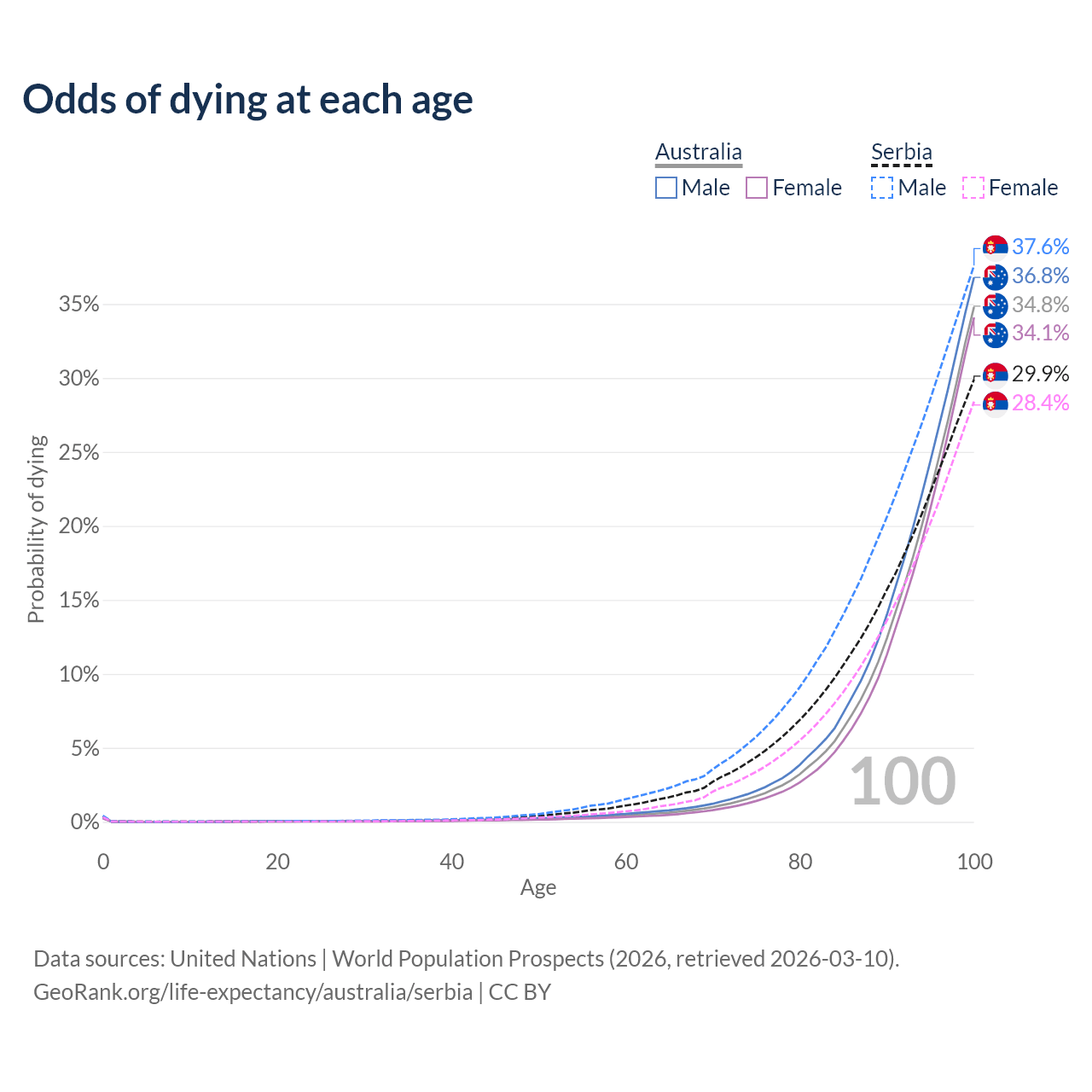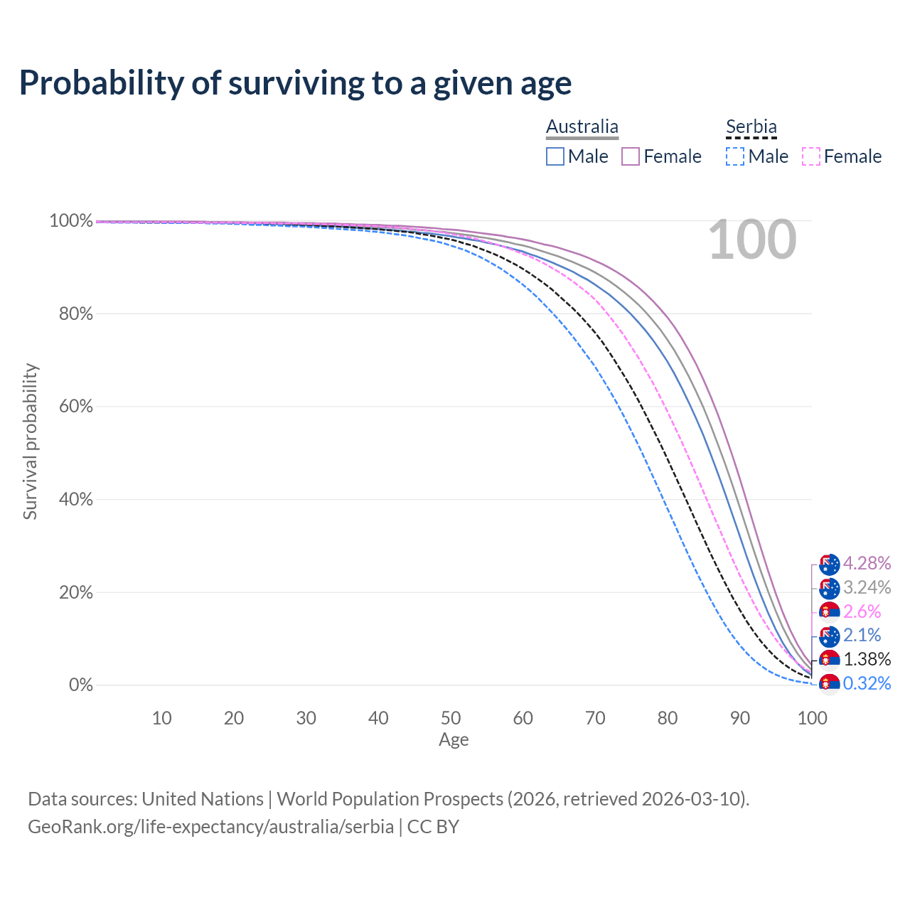 This life expectancy calculator shows the odds of living to 100, 95, 90, and below based on current age for both males and females in Australia and Serbia, along with mean and median age of death. The calculations are based on the 2026 life tables (actuarial tables) from the UN World Population Prospects.