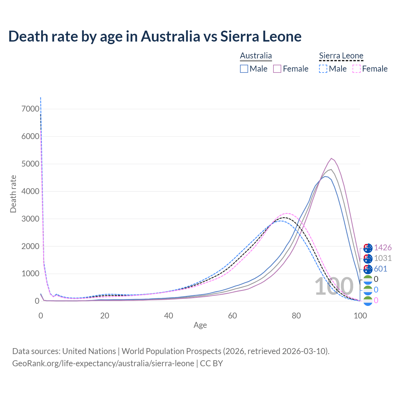 In Australia, the most common age of death is 91, compared to 0 in Sierra Leone. The median age of death is 87.5 in Australia and 70.8 in Sierra Leone, meaning only half of each cohort is expected to live past that age.