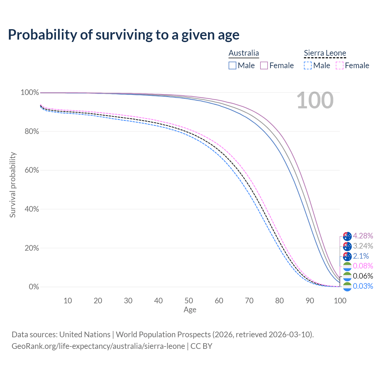 This life expectancy calculator shows the odds of living to 100, 95, 90, and below based on current age for both males and females in Australia and Sierra Leone, along with mean and median age of death. The calculations are based on the 2026 life tables (actuarial tables) from the UN World Population Prospects.