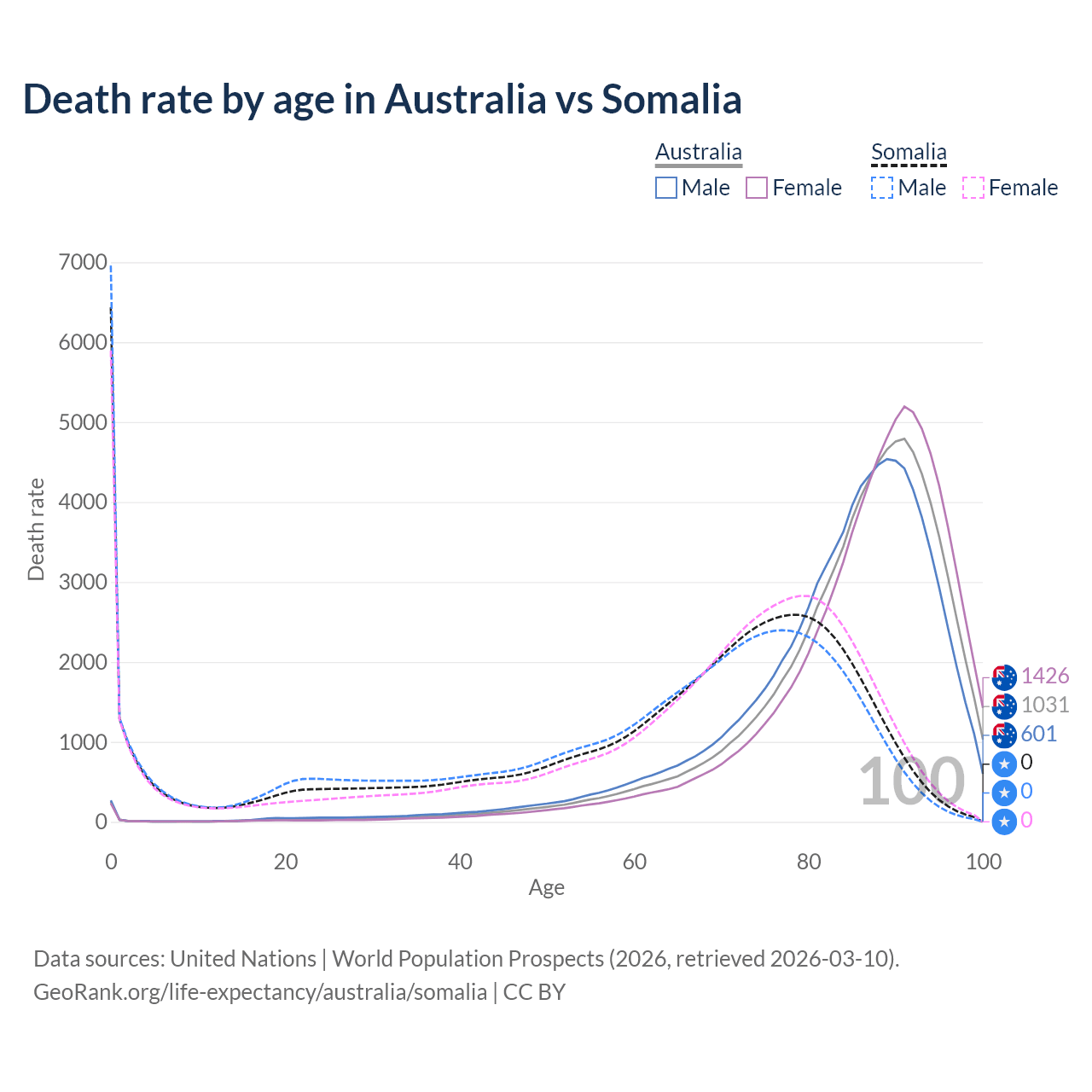 This life expectancy calculator shows the odds of living to 100, 95, 90, and below based on current age for both males and females in Australia and Somalia, along with mean and median age of death. The calculations are based on the 2026 life tables (actuarial tables) from the UN World Population Prospects.