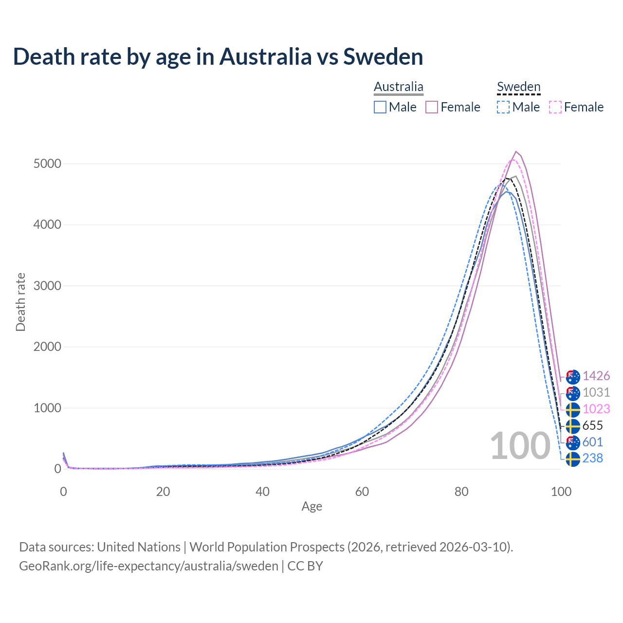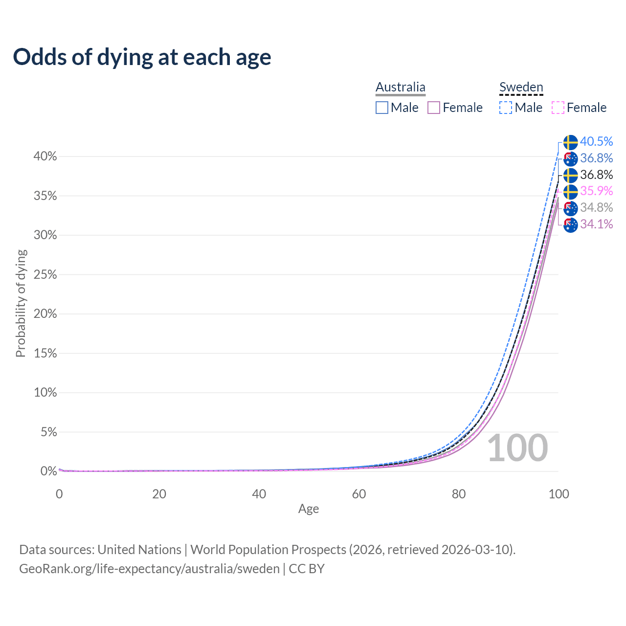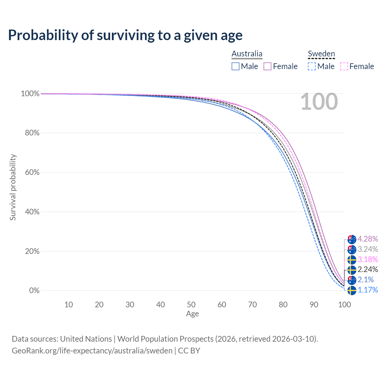 This life expectancy calculator shows the odds of living to 100, 95, 90, and below based on current age for both males and females in Australia and Sweden, along with mean and median age of death. The calculations are based on the 2026 life tables (actuarial tables) from the UN World Population Prospects.