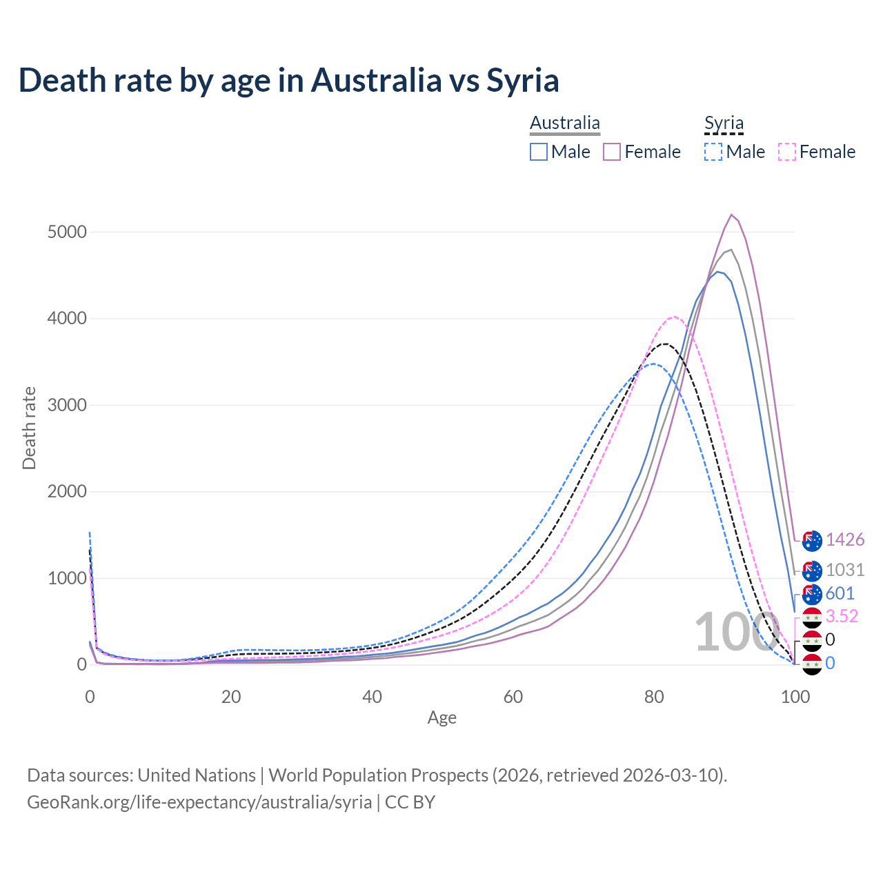 In Australia, the most common age of death is 91, compared to 82 in Syria. The median age of death is 87.5 in Australia and 77.7 in Syria, meaning only half of each cohort is expected to live past that age.