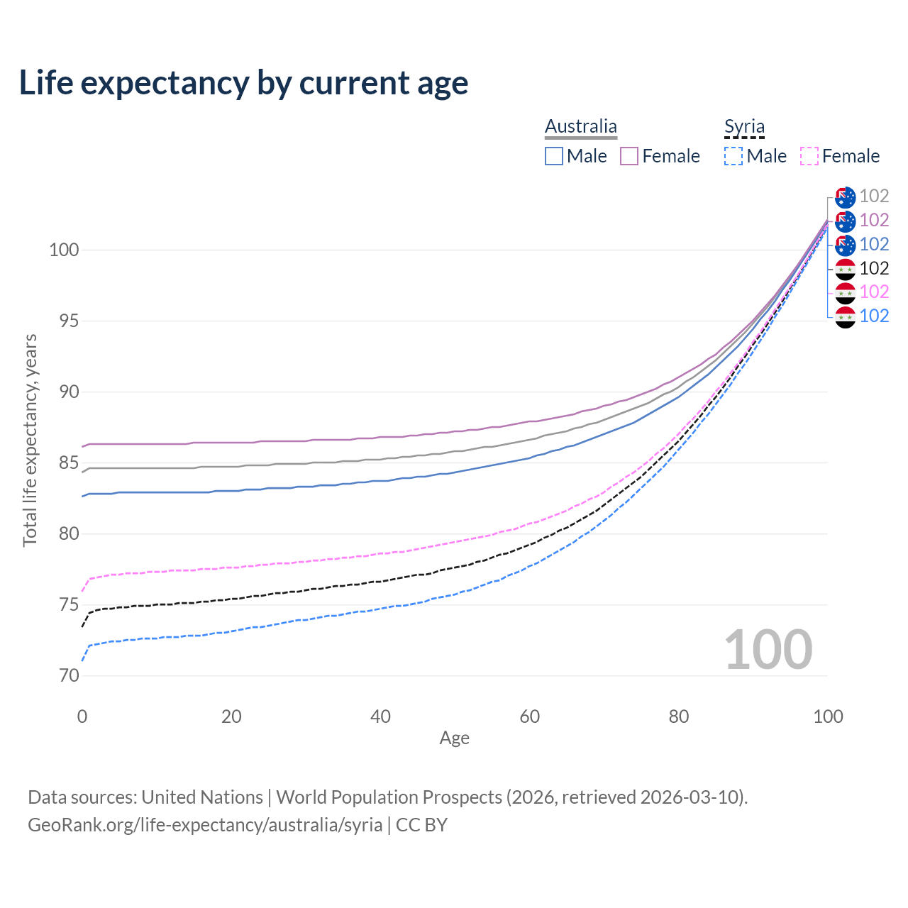 The average life expectancy at birth is 84.3 years in Australia vs 73.4 in Syria. Australia is ranked 7/197 by life expectancy, and Syria is 108/197. In Australia, the life expectancy is 82.6 years for males and 86.1 years for females. In Syria, it's 71 years for males and 75.9 years for females.