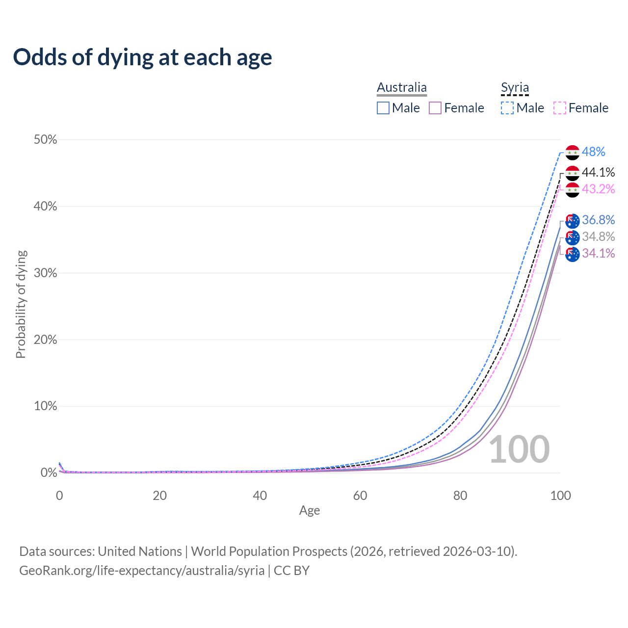 This life expectancy calculator shows the odds of living to 100, 95, 90, and below based on current age for both males and females in Australia and Syria, along with mean and median age of death. The calculations are based on the 2026 life tables (actuarial tables) from the UN World Population Prospects.
