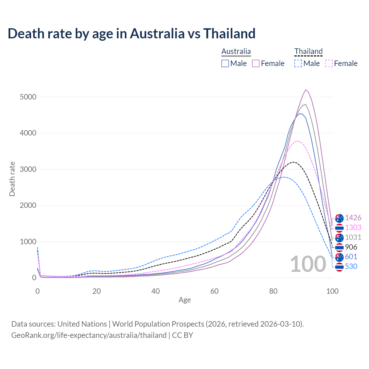 In Australia, the most common age of death is 91, compared to 87 in Thailand. The median age of death is 87.5 in Australia and 81.8 in Thailand, meaning only half of each cohort is expected to live past that age.