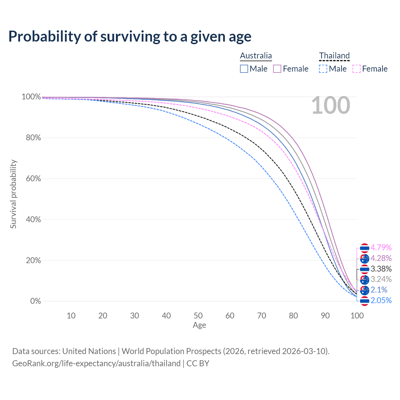 This life expectancy calculator shows the odds of living to 100, 95, 90, and below based on current age for both males and females in Australia and Thailand, along with mean and median age of death. The calculations are based on the 2026 life tables (actuarial tables) from the UN World Population Prospects.