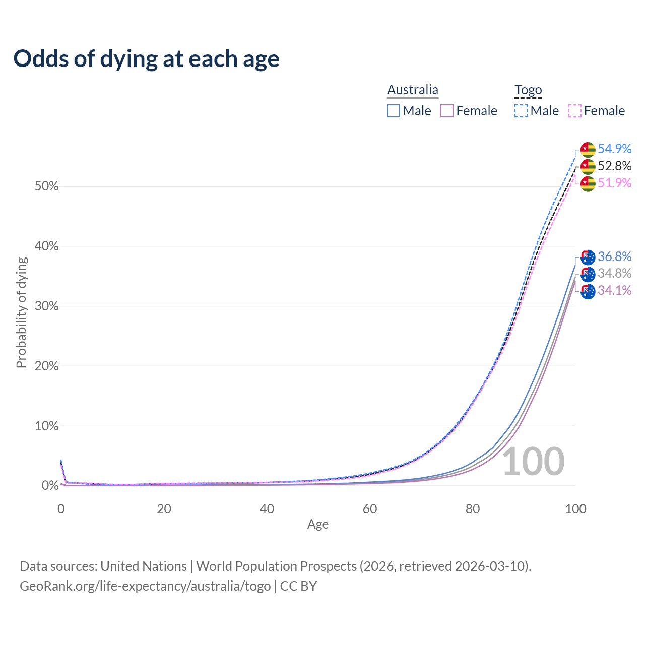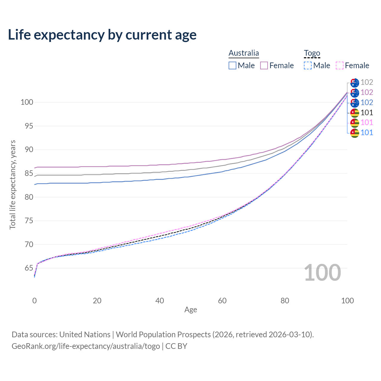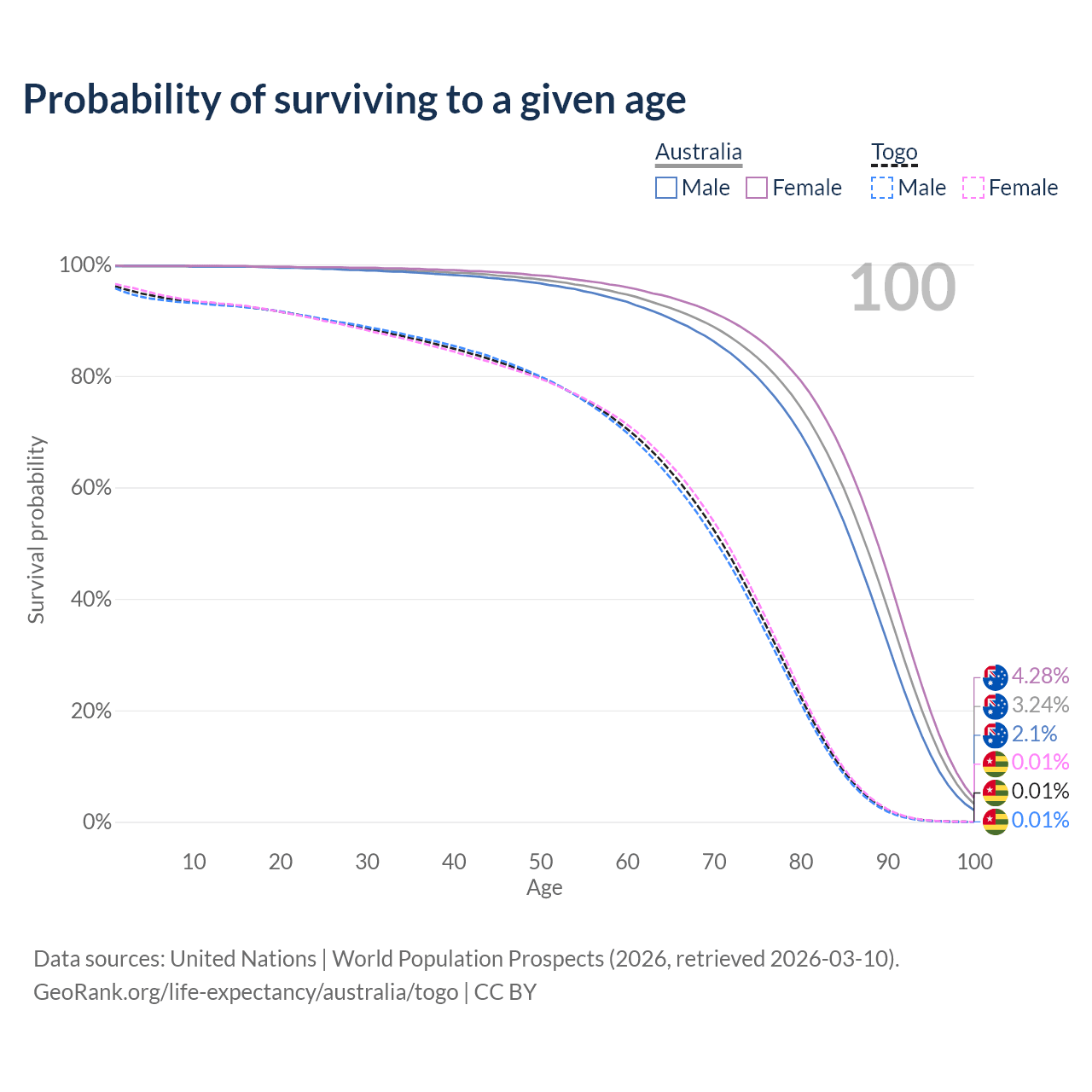 This life expectancy calculator shows the odds of living to 100, 95, 90, and below based on current age for both males and females in Australia and Togo, along with mean and median age of death. The calculations are based on the 2026 life tables (actuarial tables) from the UN World Population Prospects.