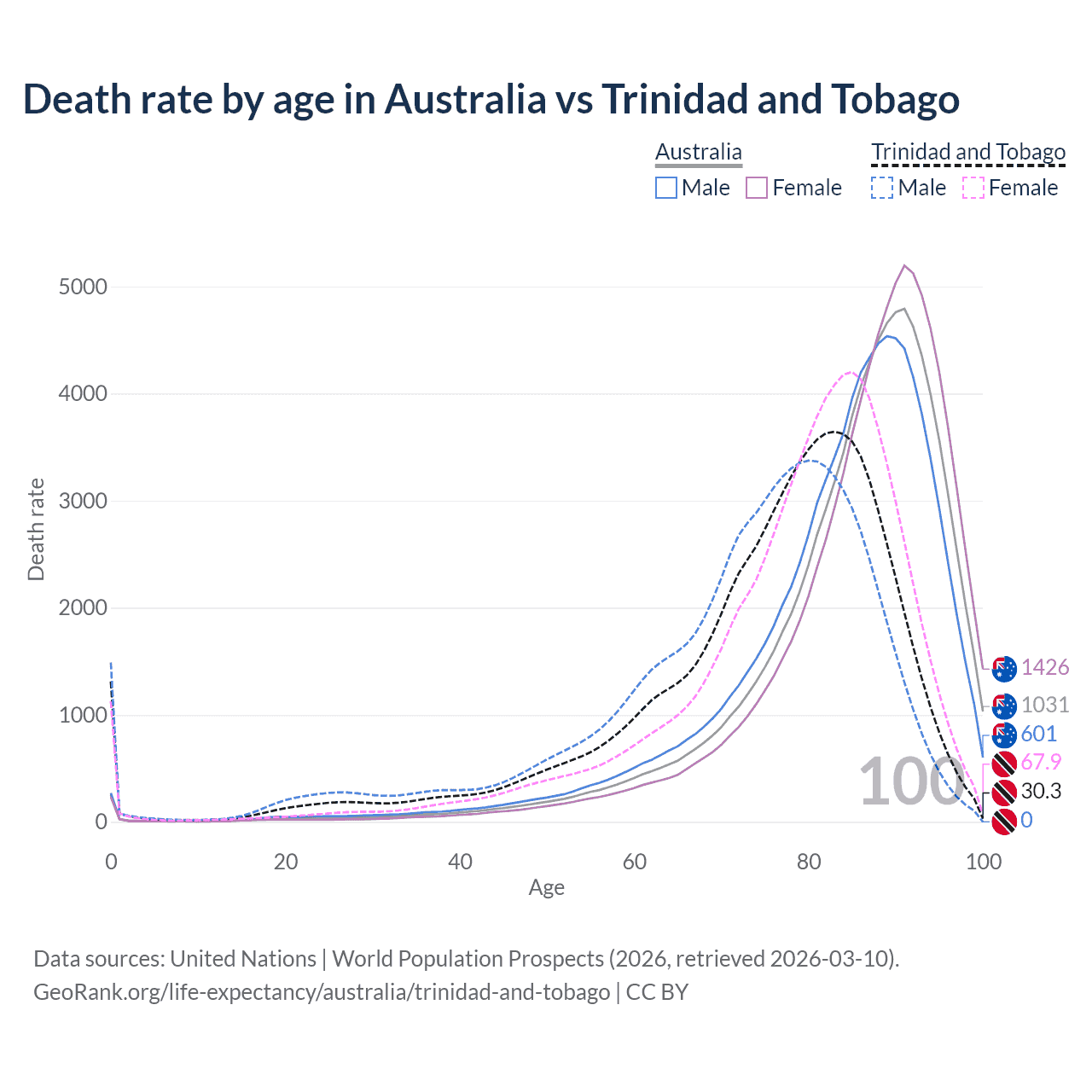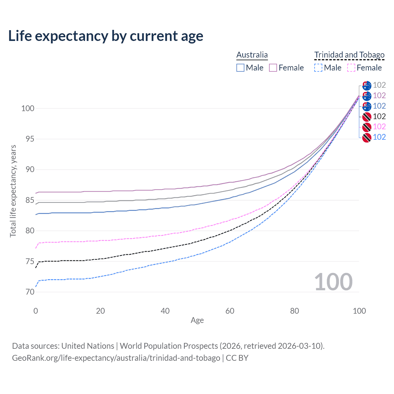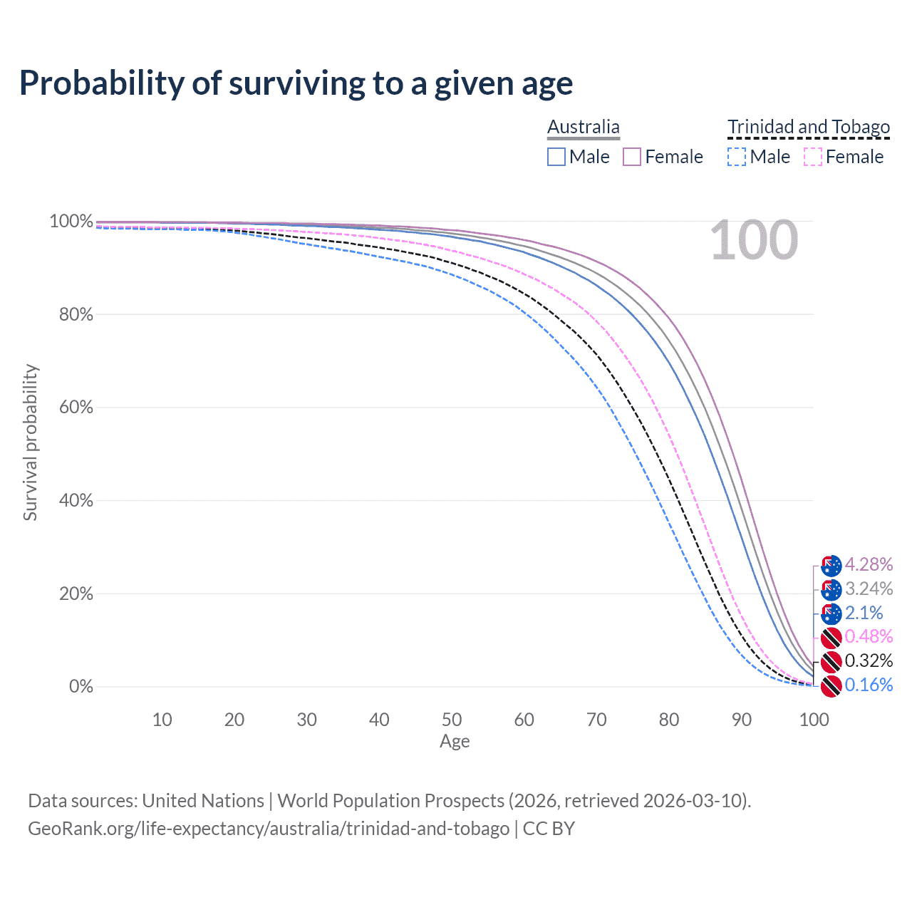 This life expectancy calculator shows the odds of living to 100, 95, 90, and below based on current age for both males and females in Australia and Trinidad and Tobago, along with mean and median age of death. The calculations are based on the 2026 life tables (actuarial tables) from the UN World Population Prospects.