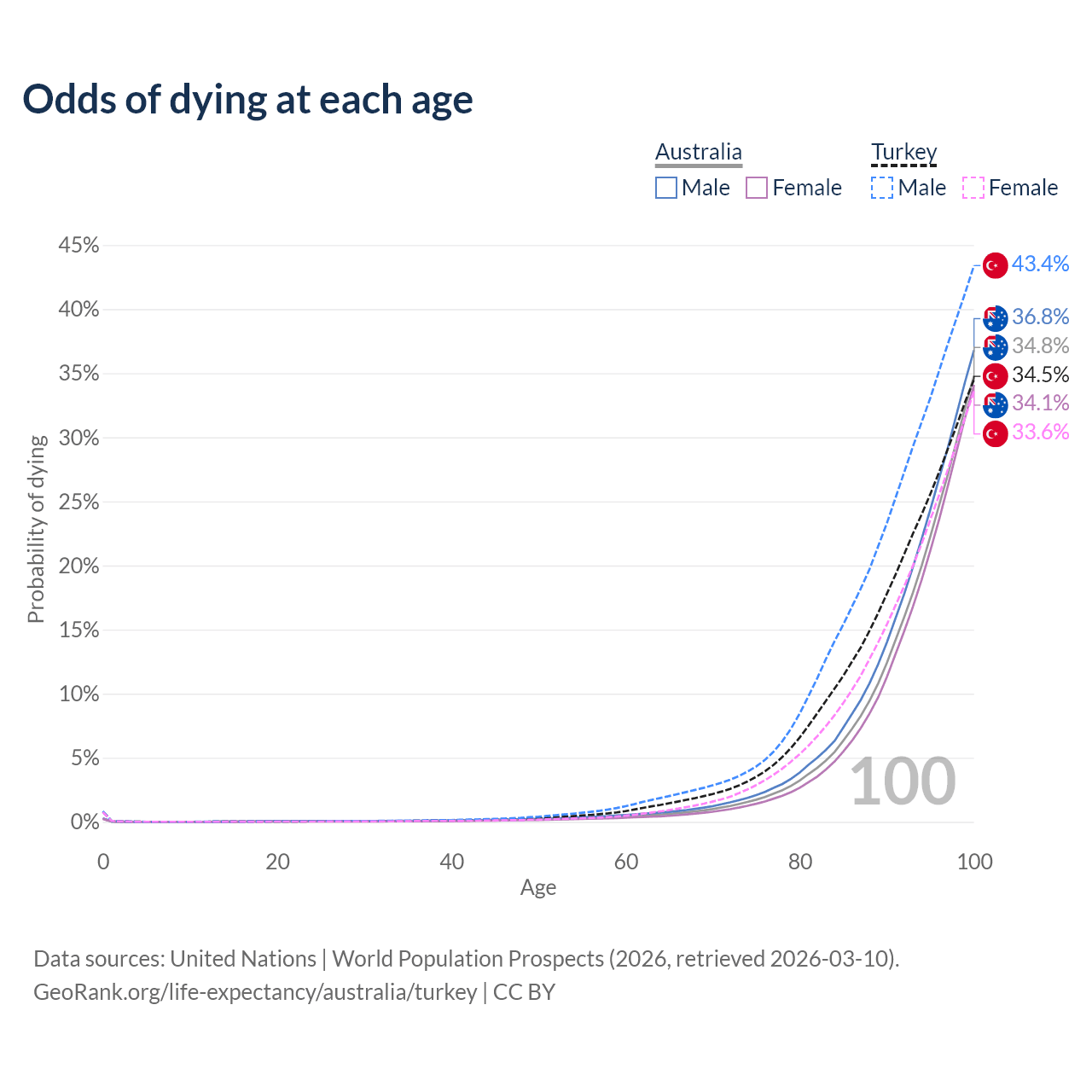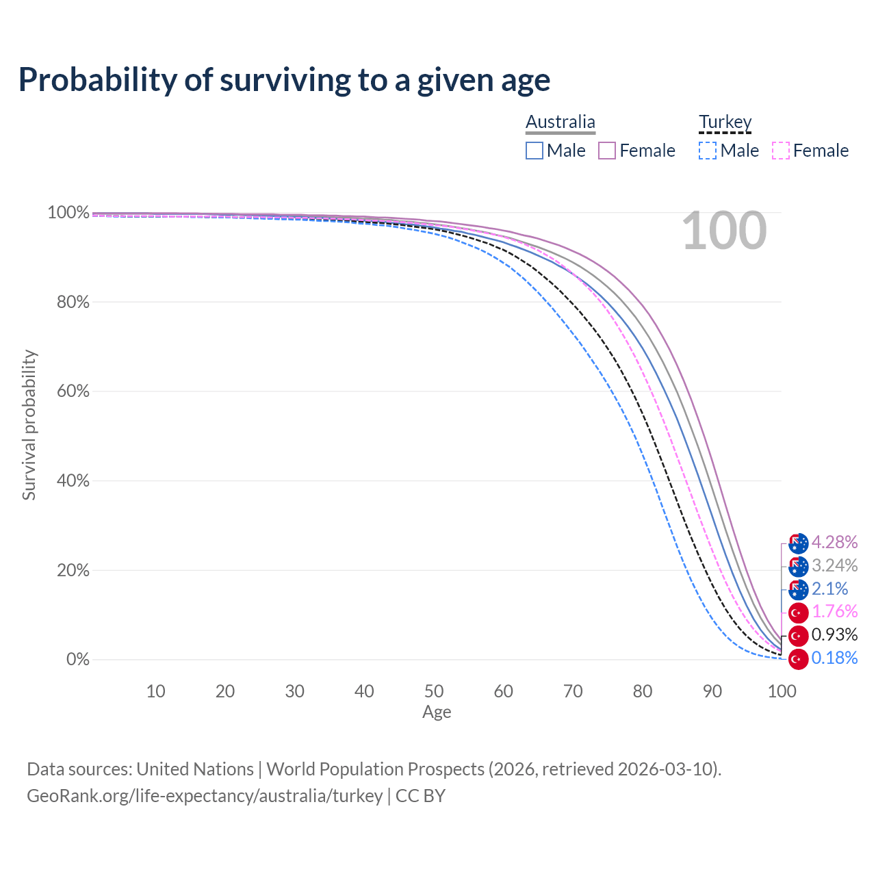 This life expectancy calculator shows the odds of living to 100, 95, 90, and below based on current age for both males and females in Australia and Turkey, along with mean and median age of death. The calculations are based on the 2026 life tables (actuarial tables) from the UN World Population Prospects.