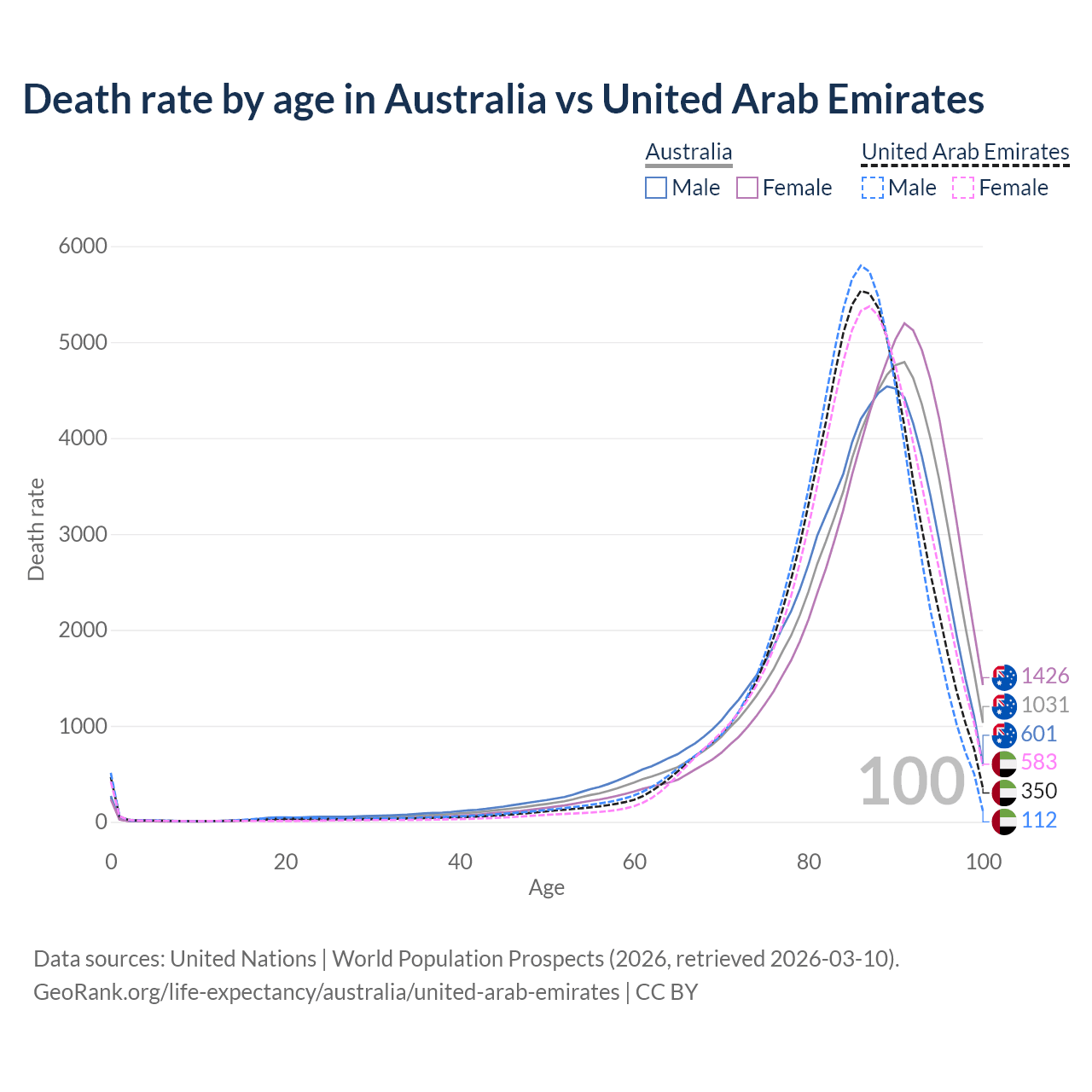 In Australia, the most common age of death is 91, compared to 86 in the United Arab Emirates. The median age of death is 87.5 in Australia and 85.6 in the United Arab Emirates, meaning only half of each cohort is expected to live past that age.