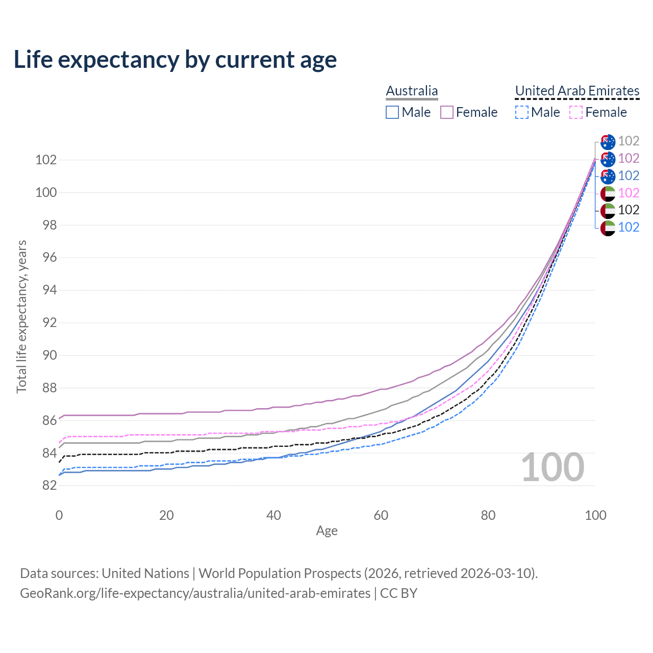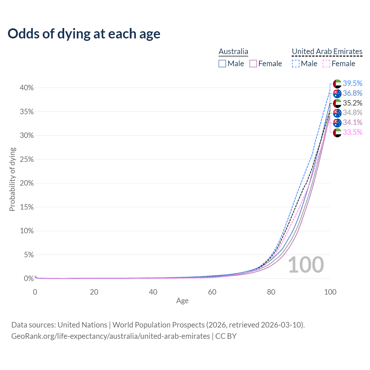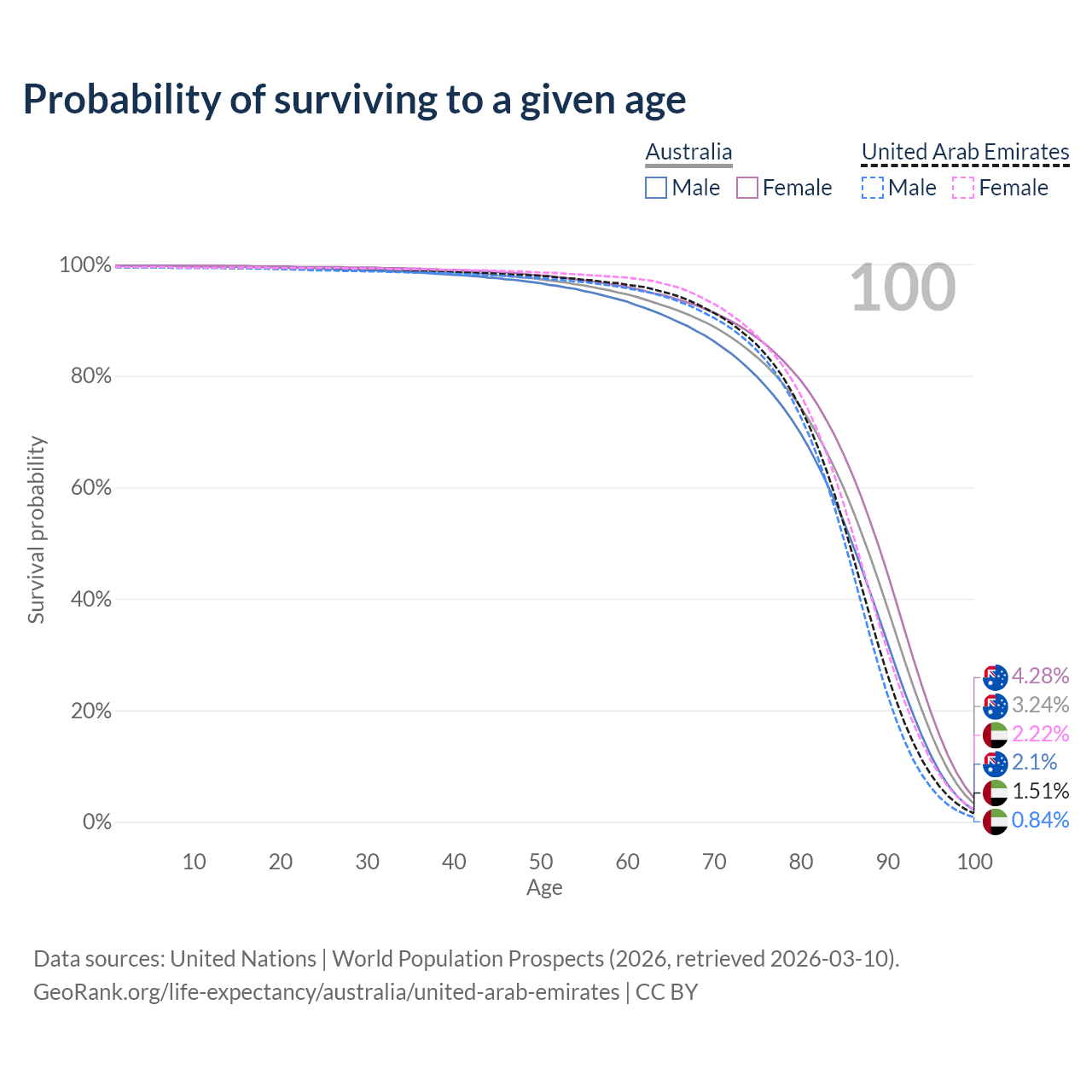 This life expectancy calculator shows the odds of living to 100, 95, 90, and below based on current age for both males and females in Australia and the United Arab Emirates, along with mean and median age of death. The calculations are based on the 2026 life tables (actuarial tables) from the UN World Population Prospects.