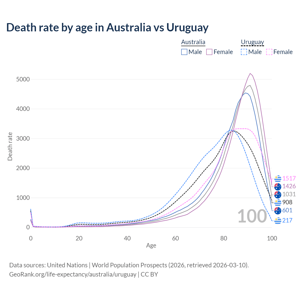 In Australia, the most common age of death is 91, compared to 84 in Uruguay. The median age of death is 87.5 in Australia and 81.8 in Uruguay, meaning only half of each cohort is expected to live past that age.